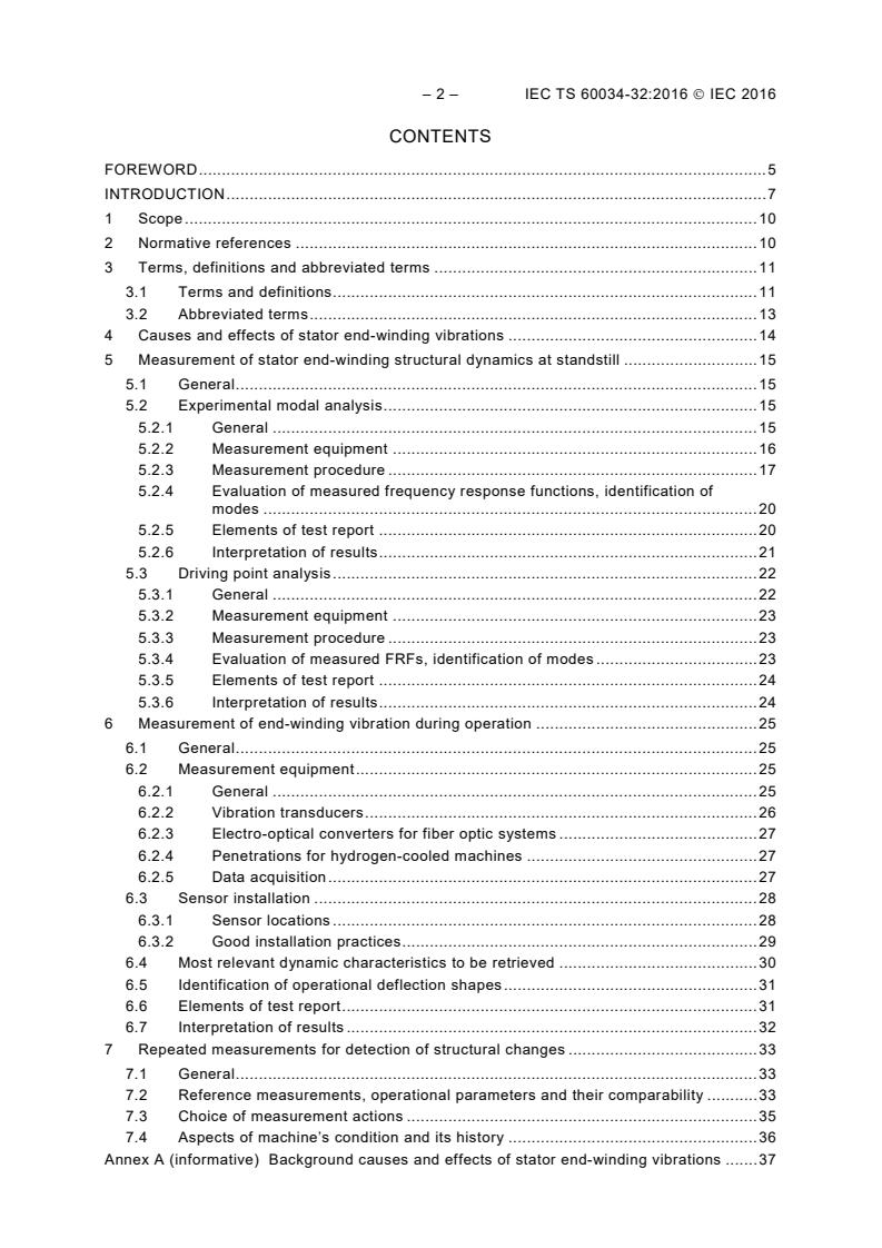 IEC TS 60034-32:2016 is a technical specification published by the International Electrotechnical Commission (IEC). Its full title is "Rotating electrical machines - Part 32: Measurement of stator end-winding vibration at form-wound windings". This standard covers: IEC TS 60034-32:2016(E) is intended to provide consistent guidelines for measuring and reporting end-winding vibration behaviour during operation and at standstill. It - defines terms for measuring, analysis and evaluation of stator end-winding vibration and related structural dynamics; - gives guidelines for measuring dynamic / structural characteristics offline and stator end-winding vibrations online; - describes instrumentation and installation practices for end-winding vibration measurement equipment; - establishes general principles for documentation of test results; - describes the theoretical background of stator end-winding vibrations. This part of IEC 60034 is applicable to three-phase synchronous generators and three-phase synchronous direct online (DOL) motors.