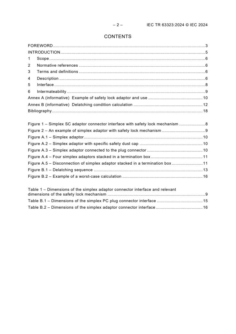 IEC TR 63323:2024 is a Technical Report from the IEC that studies an SC connector adaptor with a safety lock mechanism for fibre optic interconnecting devices and passive components. The document proposes a minor external modification to the standard SC adaptor-adding a flexible locking projection on the adaptor top surface-to create a push‑latch‑pull mating sequence that resists accidental disconnection and remains compatible with the SC interface defined in IEC 61754-4.