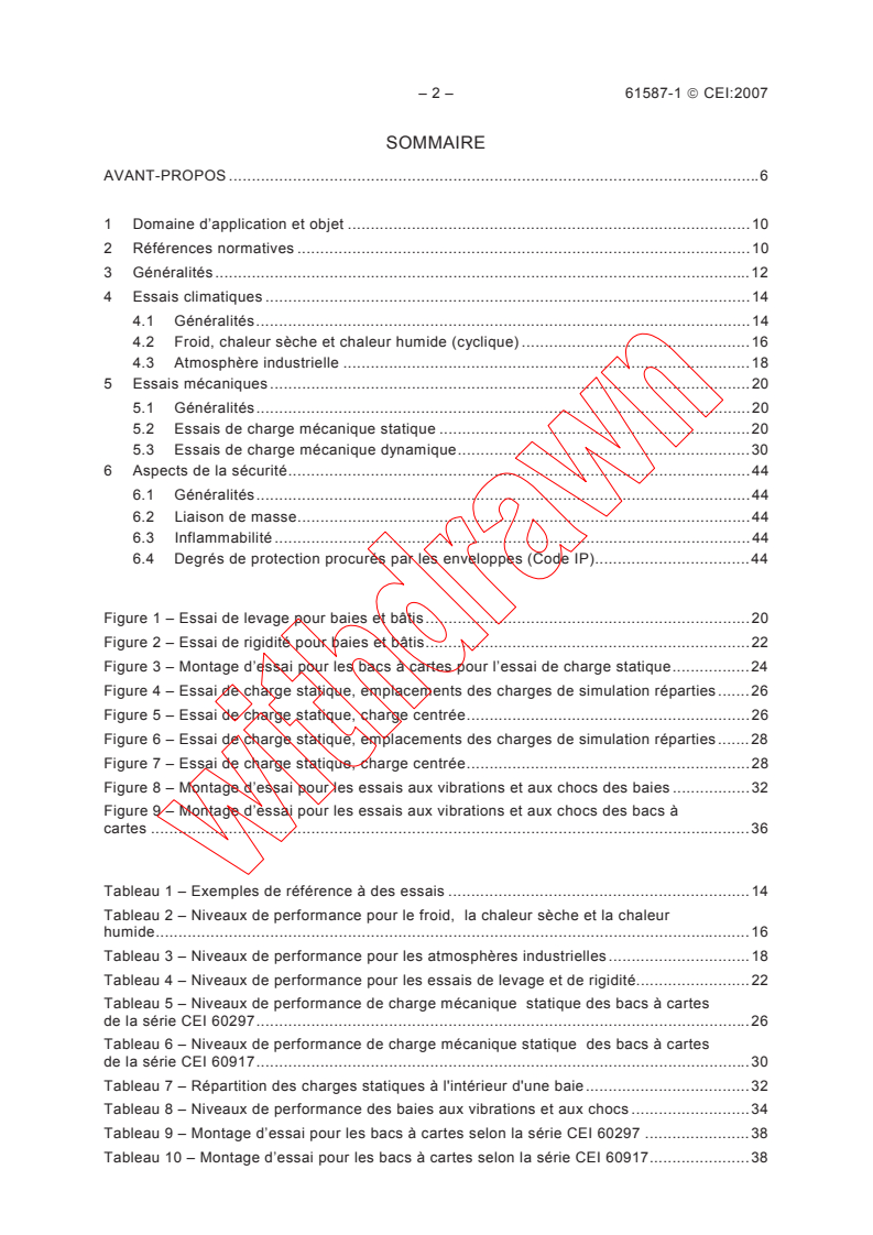 Keywords: IEC 61587-1, mechanical structures, electronic equipment, climatic tests, mechanical tests, safety aspects, cabinets, racks, subracks, chassis, IEC 60917, IEC 60297, indoor applications, environmental performance, static load test, dynamic load test, vibration test, shock test, IP Code, flammability, earth bonding, industrial atmosphere.