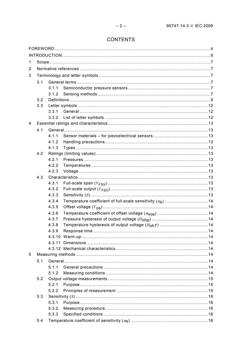 IEC 60747-14-3:2009 specifies requirements for semiconductor pressure sensors measuring absolute, gauge or differential pressures. The major technical change with regard to the previous edition is the addition of a new subclause 5.9 (measuring method of linearity).