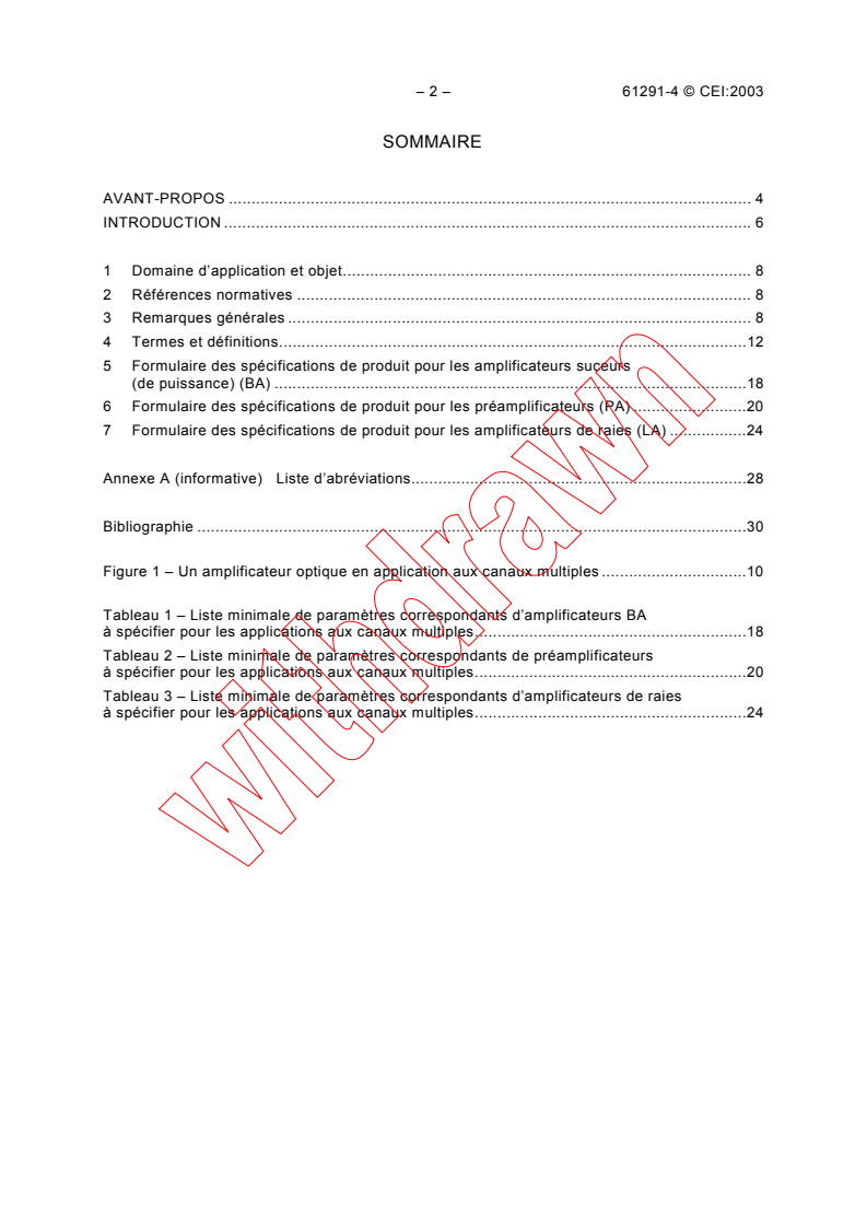 IEC 61291-4:2003, titled Optical Amplifiers - Part 4: Multichannel Applications - Performance Specification Template, is an international standard published by the International Electrotechnical Commission (IEC). This standard specifies a performance specification framework tailored to optical amplifier (OA) devices and subsystems designed for multichannel applications in fiber optic systems.