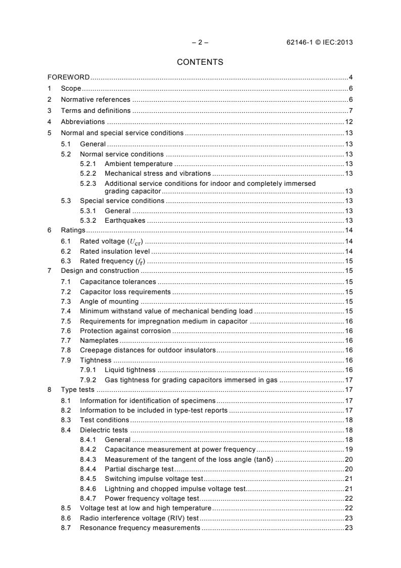 IEC 62146-1:2013 is an international standard published by the International Electrotechnical Commission (IEC) that defines the technical requirements and guidelines for grading capacitors used in high-voltage alternating current circuit-breakers. These grading capacitors play a critical role in ensuring the effective and safe operation of multi-break and single-break circuit-breakers by controlling voltage distribution and modifying transient recovery voltage (TRV). The standard covers grading capacitors intended for both air-insulated and enclosed circuit-breakers, including those immersed in insulating gases like SF6 or in oil.