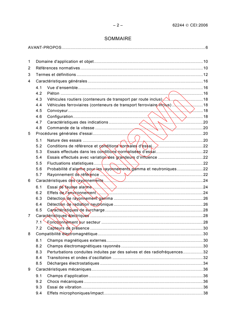 Définit les performances des moniteurs installés pour la détection des émetteurs de rayonnements gamma et neutronique contenus dans des objets/conteneurs ou des véhicules, des caractéristiques générales, des caractéristiques mécaniques, des exigences d'environnement, des procédures d'essai et de la documentation. Ces moniteurs sont utilisés pour surveiller des véhicules, des containers de cargo, des personnes ou des colis et ils sont le plus souvent situés aux frontières nationales et internationales, mais ils peuvent être situés partout où il y a un besoin de ce type de surveillance.