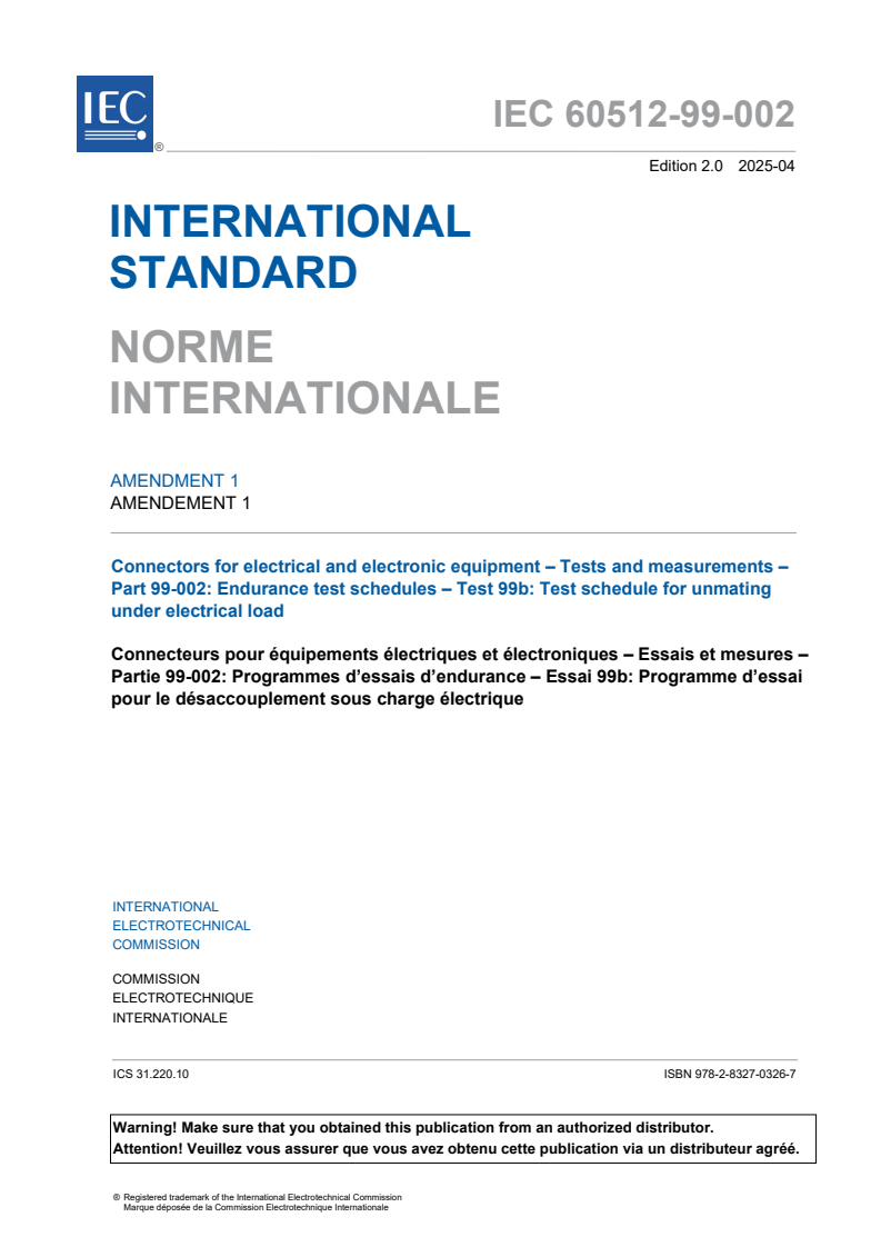 IEC 60512-99-002:2022/AMD1:2025 - Amendment 1 - Connectors for electrical and electronic equipment - Tests and measurements - Part 99-002: Endurance test schedules - Test 99b: Test schedule for unmating under electrical load Released:9. 04. 2025 Isbn:9782832703267