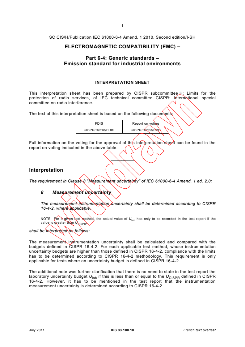 SC CIS/H/Publication IEC 61000-6-4 Amend. 1 2010, Deuxième édition/I-SH