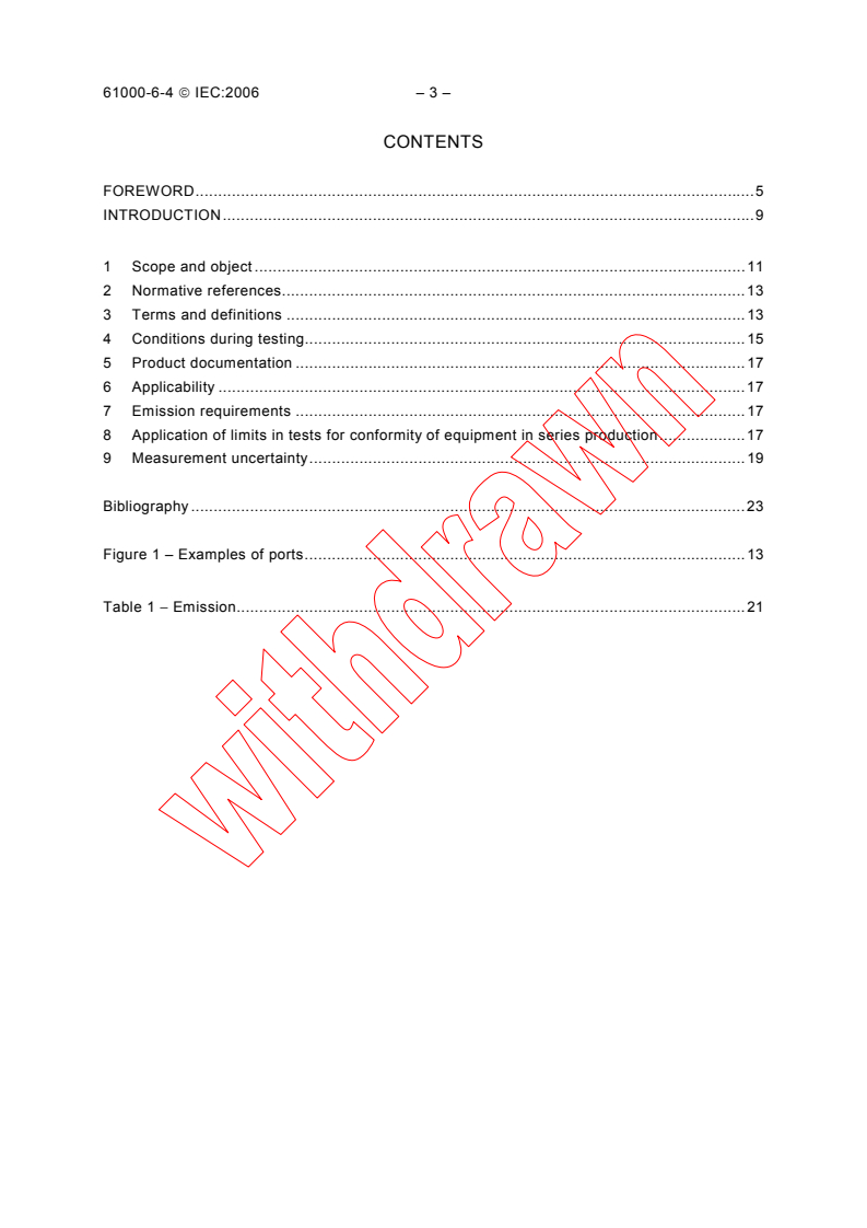 IEC 61000-6-4:2006 is a standard published by the International Electrotechnical Commission (IEC). Its full title is "Electromagnetic compatibility (EMC) - Part 6-4: Generic standards - Emission standard for industrial environments". This standard covers: This part of IEC 61000 for EMC emission requirements applies to electrical and electronic apparatus intended for use in industrial environments as described below. Emission requirements in the frequency range 0 Hz to 400 GHz are covered. No measurement needs to be performed at frequencies where no requirement is specified. This generic EMC emission standard is applicable if no relevant dedicated product or product-family EMC emission standard exists. This standard applies to a apparatus intended to be connected to a power network supplied from a high or medium voltage transformer dedicated to the supply of an installation feeding manufacturing or similar plant, and intended to operate in or in proximity to industrial locations, as described below. This standard applies also to apparatus, which is battery operated and intended to be used in industrial locations. The environments encompassed by this standard are industrial, both indoor and outdoor. Industrial locations are in addition characterised by the existence of one or more of the following examples: - industrial, scientific and medical (ISM) apparatus; - heavy inductive or capacitive loads that are frequently switched; - high currents and associated magnetic fields. The object of this standard is to define the emission test requirements for apparatus defined in the scope in relation to continuous and transient, conducted and radiated disturbances. The emission requirements have been selected so as to ensure that disturbances generated by apparatus operating normally in industrial locations do not exceed a level that could prevent other apparatus from operating as intended. Fault conditions of apparatus are not taken into account. Not all disturbance phenomena have been included for testing purposes in this standard but only those considered as relevant for the equipment covered by this standard. These requirements represent essential electromagnetic compatibility emission requirements. Requirements are specified for each port considered.