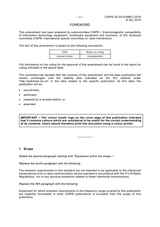 Scope Update: The amendment revises the scope by excluding equipment with emission requirements already covered by other CISPR publications and clarifies that intentional radio transmissions and related spurious emissions are outside this standard's scope.