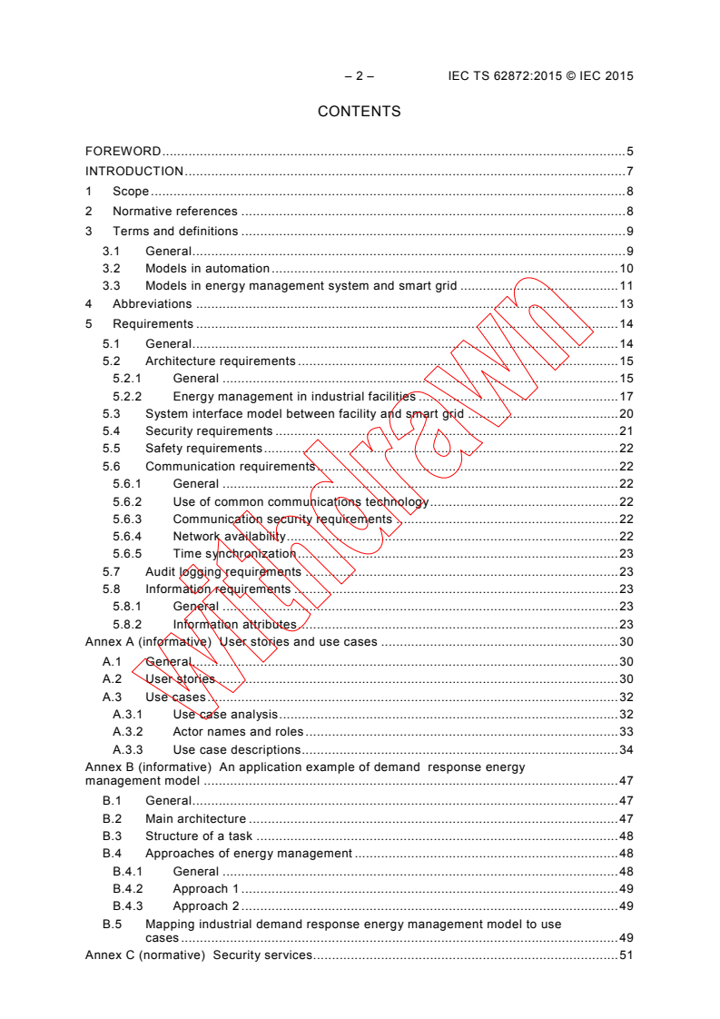 IEC TS 62872:2015 is a technical specification published by the International Electrotechnical Commission (IEC). Its full title is "Industrial-process measurement, control and automation system interface between industrial facilities and the smart grid". This standard covers: IEC TS 62872:2015(E) defines the interface, in terms of information flow, between industrial facilities and the "smart grid". It identifies profiles and extends where required, the standards needed to allow the exchange of the information needed to support the planning, management and control of electric energy flow between the industrial facility and the smart grid.