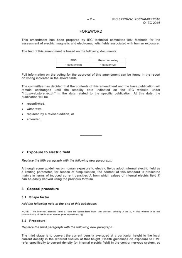 IEC 62226-3-1:2007/AMD1:2016 - Amendment 1 - Exposure to electric or magnetic fields in the low and intermediate frequency range - Methods for calculating the current density and internal electric field induced in the human body - Part 3-1: Exposure to electric fields - Analytical and 2D numerical models