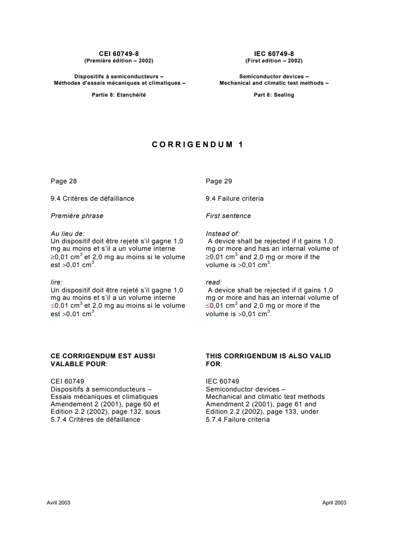 Corrigendum 1 - Dispositifs à semiconducteurs - Méthodes d'essais mécaniques et climatiques - Partie 8: Etanchéité