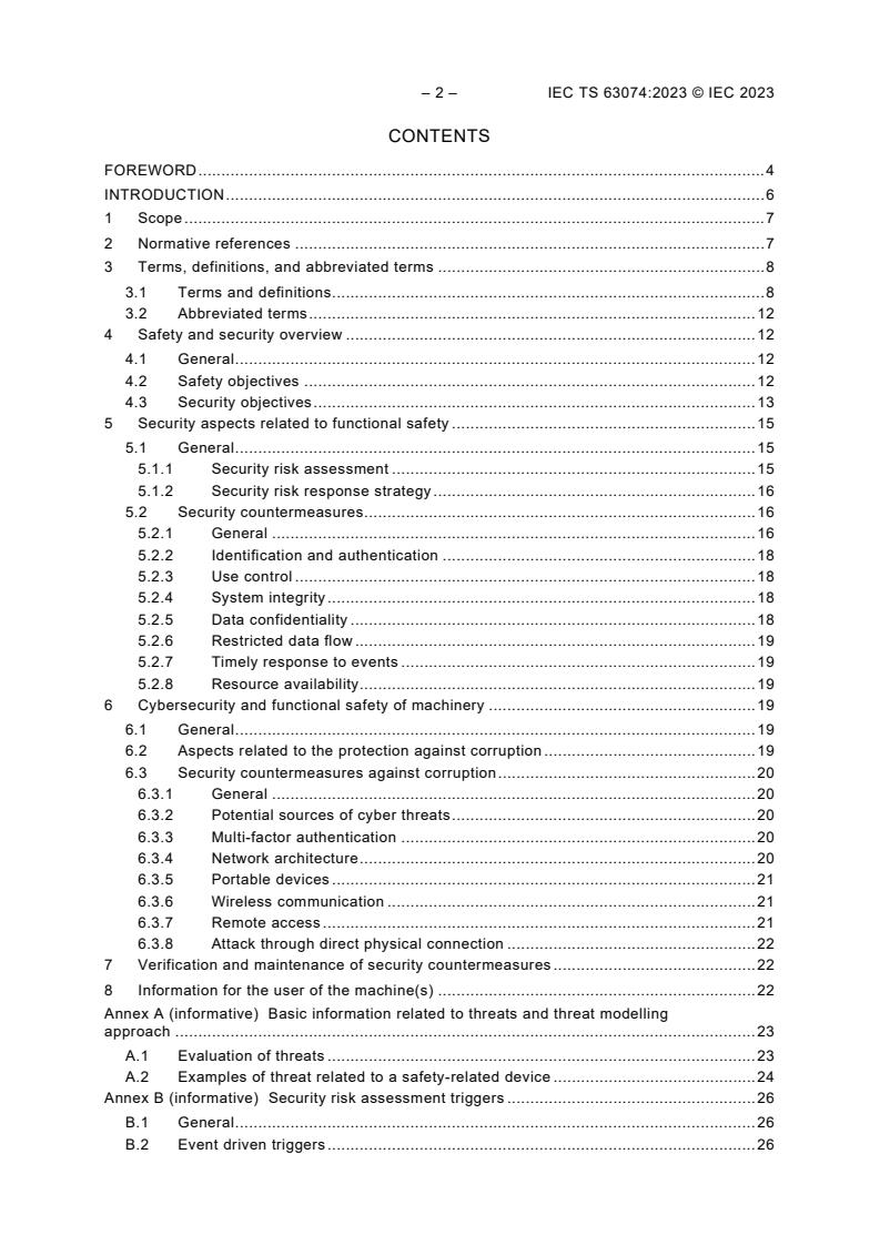 IEC TS 63074:2023 identifies the relevant aspects of the IEC 62443 series related to security threats and vulnerabilities that are considered for the design and implementation of safety-related control systems (SCS) which can lead to the loss of the ability to maintain safe operation of a machine. Typical security aspects related to the machine with potential relation to SCS are: – vulnerabilities of the SCS either directly or indirectly through the other parts of the machine which can be exploited by security threats that can result in security attacks (security breach); – influence on the safety characteristics and ability of the SCS to properly perform its function(s); – typical use case definition and application of a corresponding threat model. Non-safety-related aspects of security threats and vulnerabilities are not considered in this document. The focus of this document is on intentional malicious actions. However, intentional hardware manipulation (e.g. wiring, exchange of components) or foreseeable misuse by physical manipulation of SCS (e.g. physical bypass) is not considered in this document. This document does not cover security requirements for information technology (IT) products and for the design of devices used in the SCS (e.g., product specific standards can be available, such as IEC TS 63208).