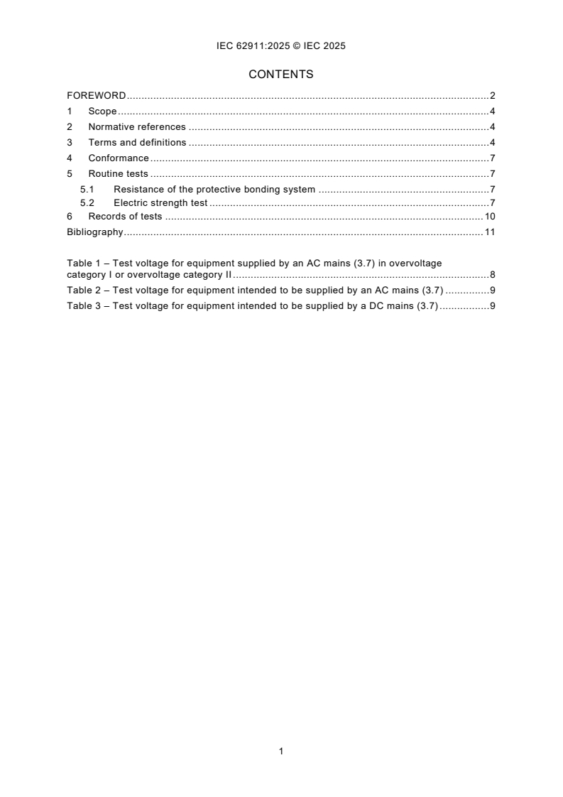 IEC 62911:2025 is a standard published by the International Electrotechnical Commission (IEC). Its full title is "Audio, video and information technology equipment - Routine electrical safety testing in production". This standard covers: IEC 62911:2025 defines procedures for use during or after manufacturing of complete equipment, sub-assemblies or components, complying with IEC 62368-1 and powered by an AC or DC, to detect manufacturing failures and unacceptable tolerances in manufacturing and materials. NOTE 1: Not all the tests defined in this document are necessarily performed at the end product manufacturing location. The optimal location for the can be defined by the equipment manufacturer and reviewed under the applicable conformity assessment scheme. NOTE 2: The test procedures in this document are intended to identify production and manufacturing errors. These test procedures are not intended for product development or verification (see The test procedures in this document are intended to identify production and manufacturing errors. These test procedures are not intended for product development or verification (see IEC 62368-1).