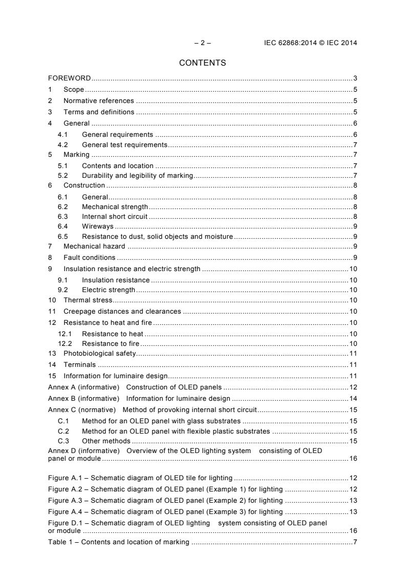 IEC 62868:2014 is a standard published by the International Electrotechnical Commission (IEC). Its full title is "Organic light emitting diode (OLED) panels for general lighting - Safety requirements". This standard covers: IEC 62868:2014 specifies the safety requirements of OLED tiles and panels for use on d.c. supplies up to 120 V or a.c. supplies up to 50 V at 50 Hz or 60 Hz for indoor and similar general lighting purpose.