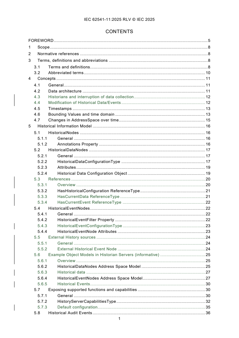 IEC 62541-11: 2025 defines the Information Model associated with Historical Access (HA). It particularly includes additional and complementary descriptions of the NodeClasses and Attributes needed for Historical Access, additional standard Properties, and other information and behaviour. The complete AddressSpace Model including all NodeClasses and Attributes is specified in IEC 62541‑3. The predefined Information Model is defined in IEC 62541‑5. The Services to detect and access historical data and events, and description of the ExtensibleParameter types are specified in IEC 62541‑4. This document includes functionality to compute and return Aggregates like minimum, maximum, average etc. The Information Model and the concrete working of Aggregates are defined in IEC 62541‑13. Conventions for Historical Access Clients are informatively provided in Annex A.