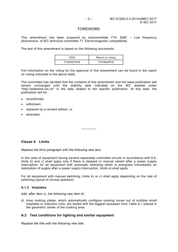IEC 61000-3-3:2013/AMD1:2017 - Amendment 1 - Electromagnetic compatibility (EMC) - Part 3-3: Limits - Limitation of voltage changes, voltage fluctuations and flicker in public low-voltage supply systems, for equipment with rated current ≤ 16 A per phase and not subject to conditional connection