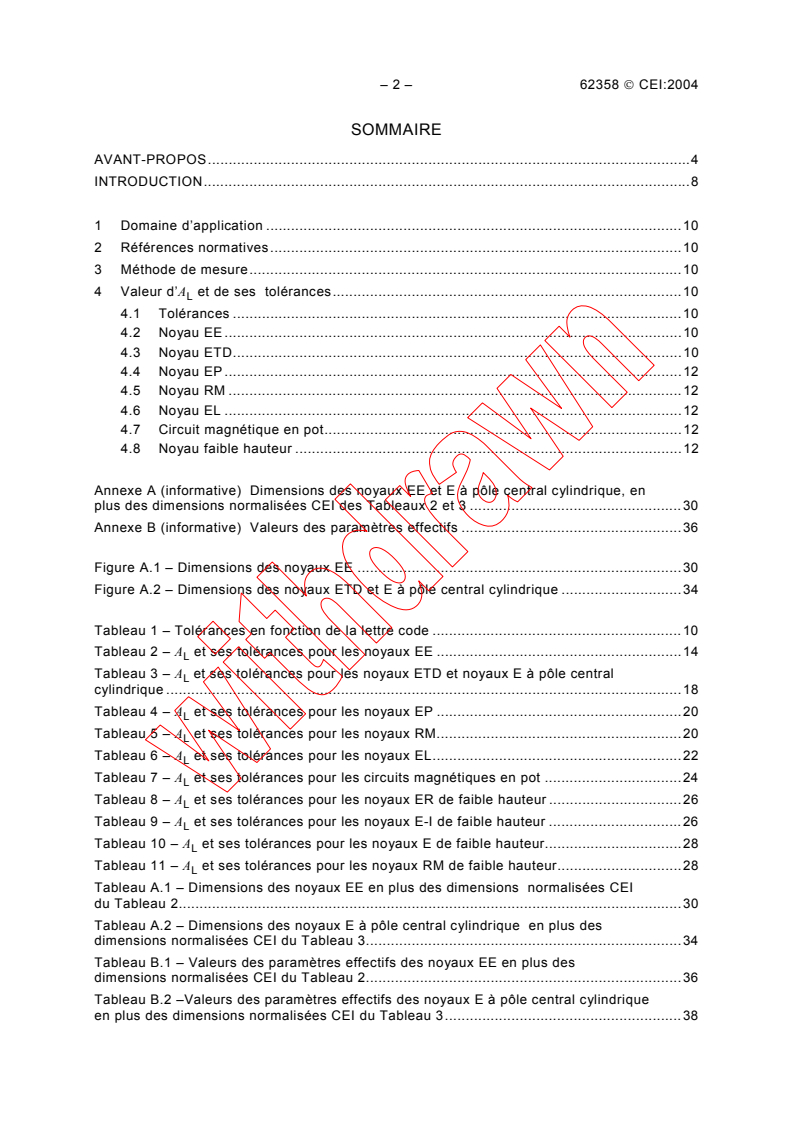IEC 62358:2004 is an international standard published by the International Electrotechnical Commission (IEC) that specifies the standard inductance factor (AL) and its associated tolerances for a variety of ferrite cores. This standard applies to commonly used core types including Pot, RM, ETD, EE, EP, EL, and low-profile ferrite cores. The document provides detailed tables and measurement methods to ensure consistent inductance characteristics for ferrite cores used in electromagnetic components.