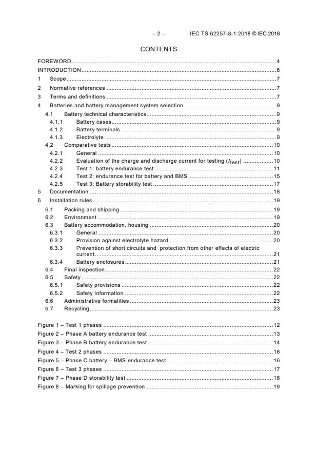 IEC TS 62257-8-1:2018(E)는 개발도상국에서 사용 가능한 자동차 플러드형 납산 배터리를 기준으로 한 PV 개별 전기화 시스템을 위한 배터리와 배터리 관리 시스템(BMS) 선택에 대한 간단하고 저렴한 비교 실험을 제안한다. 이 문서는 프로젝트 실시자가 개발도상국의 실험실에서 자체적으로 만든 자동차나 트럭 배터리의 프로젝트에 사용할 수 있는 성능을 평가하기 위한 것으로 특히 유용할 수 있다. 이 문서에서 제시하는 실험은 프로젝트의 일반적인 사양(IEC TS 62257-2 참조)과 배터리 관리 시스템 (BMS)과 연계된 배터리의 성능을 평가할 수 있도록 하며, 짧은 시간과 일반적인 기술적 수단을 사용하여 현장의 운영 조건과 가장 가깝게 지역에서 수행될 수 있다. 문서는 또한 설치의 수명과 올바른 작동, 그리고 설치 근처에 거주하는 사람들의 안전을 보장하기 위해 준수해야 할 규정과 설치 조건을 제시한다. 이번 신규 판본에는 이전 판본과 비교하여 다음과 같은 현저한 기술적 변화가 포함되어 있다: 적용 가능한 전압 수준의 증가 및 100 kW의 전력 제한의 제거.