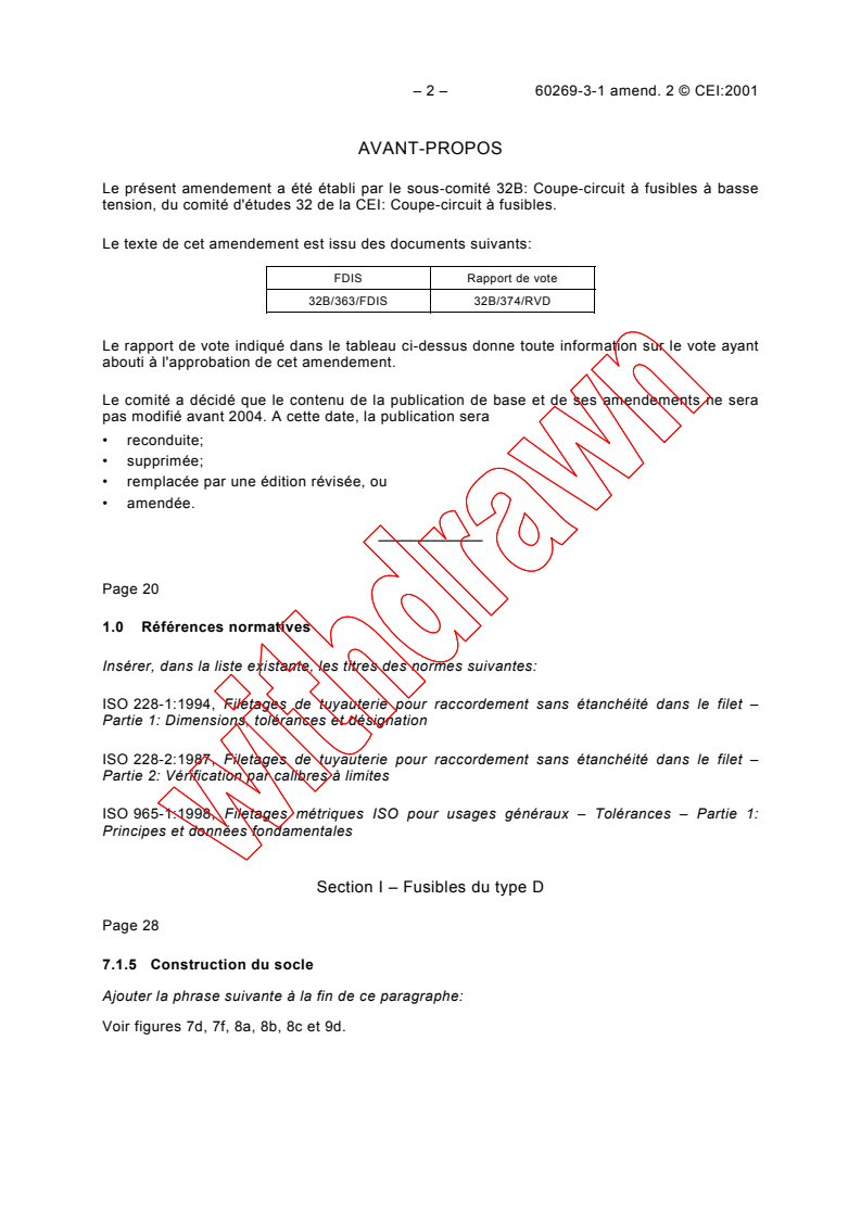 The broader series covers low-voltage fuses, including general requirements (Part 1), specific fuse types and ratings, and supplementary rules for specialized applications. The amendment complements the base IEC 60269-3-1 standard.ISO 228-1:1994 and ISO 228-2:1987