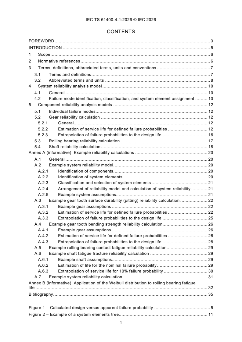 IEC TS 61400-4-1:2026 specifies a method to calculate the design reliability of wind turbines gearboxes covered by IEC 61400‑4, based upon failure modes where standardized calculation methods are publicly available. For the calculable failure mechanisms, it is possible to compare the reliability between different gearbox designs within the limitations of the theoretical models. The use of field-based statistical parameters can improve the accuracy of the calculated reliability. The calculated design reliability can provide information for the lifecycle management strategy. However, this document does not provide trade-off decisions between higher design reliability and maintenance strategies (e.g. preventive or predictive maintenance). This document does not consider repairable system analysis. Due to the lack of accepted theoretical models for some failure modes, the model can currently not predict the apparent failure probability in the field. Neither this document nor IEC 61400-4 specify a minimum value of design reliability.