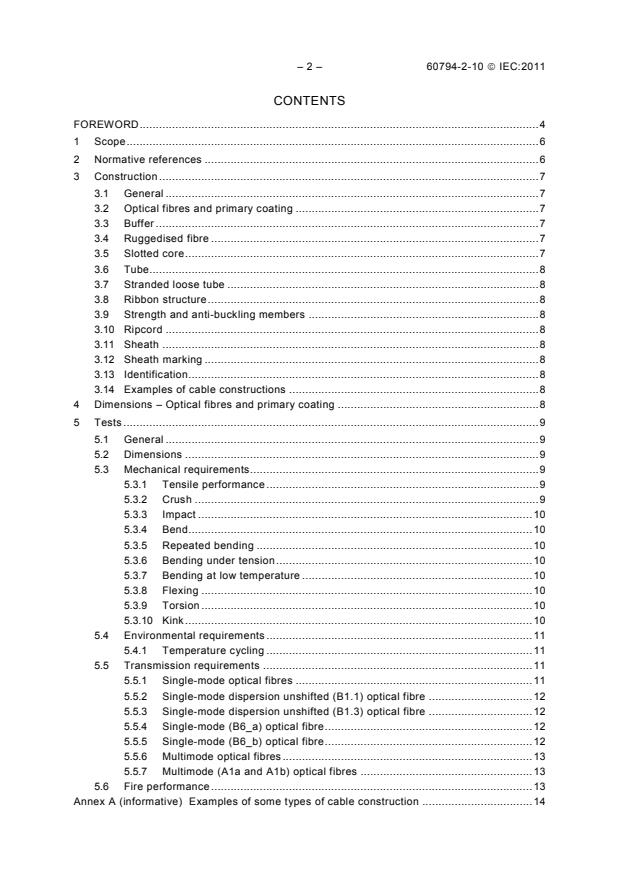 IEC 60794-2-10:2011 is an international standard published by the International Electrotechnical Commission (IEC) that specifies the family requirements for simplex and duplex indoor optical fibre cables. This standard applies to optical fibre cables intended for indoor use, excluding those used in terminated assemblies as defined by IEC 60794-2-50. It serves as a detailed guideline for manufacturers, designers, and users to ensure consistency, quality, and performance of indoor optical fibre cabling solutions.