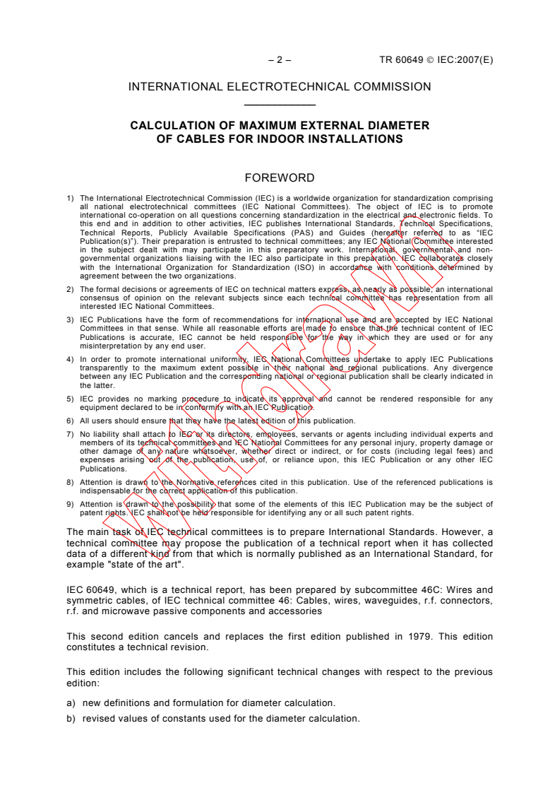 IEC TR 60649:2007 is a technical report published by the International Electrotechnical Commission (IEC). Its full title is "Calculation of maximum external diameter of cables for indoor installations". This standard covers: It gives guidance for calculation of the overall cable diameter according to the structure and the dimensions of the cable elements.Includes the following significant technical changes with respect to the previous edition: new definitions and formulation for diameter calculation. revised values of constants used for the diameter calculation.