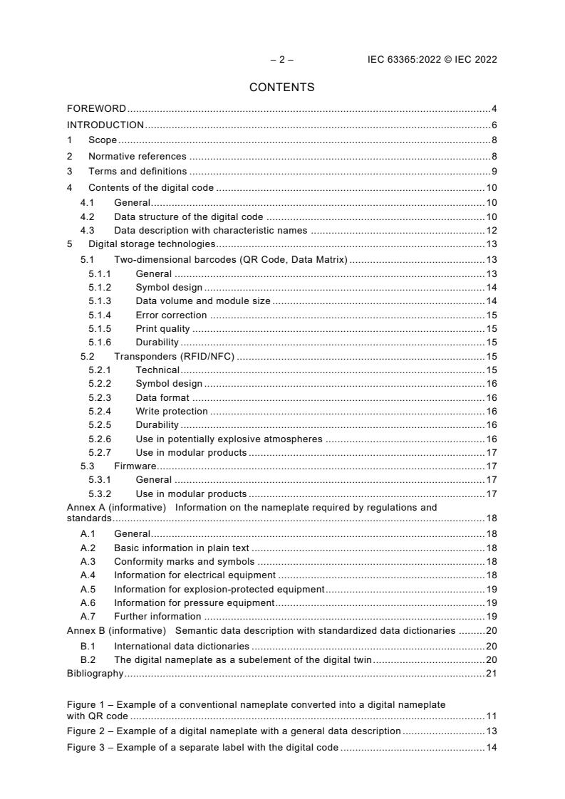IEC 63365:2022 is a standard published by the International Electrotechnical Commission (IEC). Its full title is "Industrial process measurement, control and automation - Digital nameplate". This standard covers: IEC 63365:2022 applies to products used in the process measurement, control and automation industry. It establishes a concept and requirements for the digital nameplate and provides alternative electronically readable solutions (e.g. 2D codes, RFID or firmware) to current conventional plain text marking on the nameplate or packaging of products. The digital nameplate information is contained in the electronically readable medium affixed to the product, the packaging or accompanying documents. The digital nameplate information is available offline without Internet connection. After electronic reading, all digital nameplate information is displayed in a human readable text format. The digital nameplate also includes the Identification Link String according to IEC 61406-1 which provides additional online information for the product. This document does not specify the contents of the conventional nameplate, which are subject to regional or national regulations and standards.