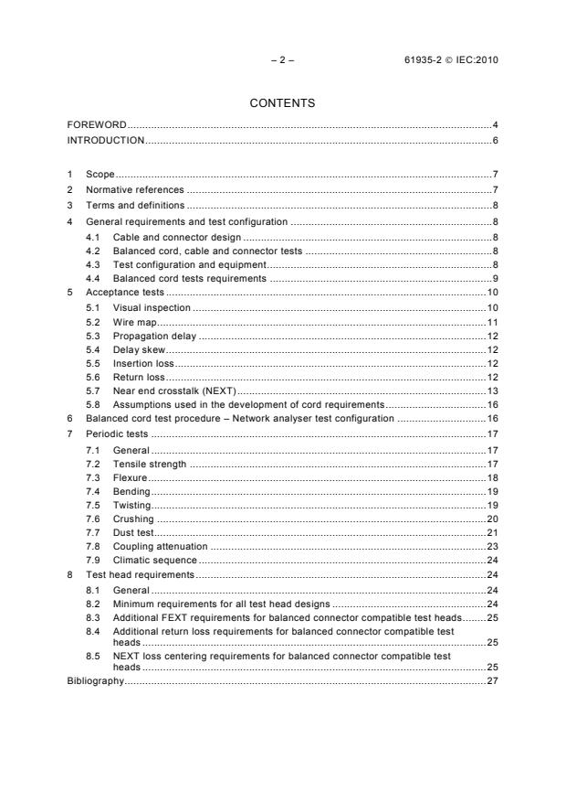 IEC 61935-2:2010 is a standard published by the International Electrotechnical Commission (IEC). Its full title is "Specification for the testing of balanced and coaxial information technology cabling - Part 2: Cords as specified in ISO/IEC 11801 and related standards". This standard covers: IEC 61935-2:2010 provides methods to ensure compatibility of balanced cords to be used in cabling according to ISO/IEC 11801 and provides test methods and associated requirements to demonstrate the performance and reliability of these balanced cords during their operational lifetime. This International Standard may also be used for providing test methods for assessing the behaviour of other balanced cords. This third edition cancels and replaces the second edition published in 2005. It differs from the second edition in that it covers category 6A to category 7A cords as defined in ISO/IEC 11801.