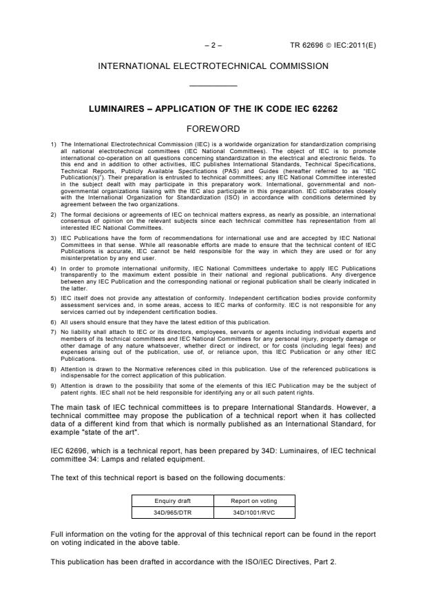 IEC TR 62696:2011 is a technical report published by the International Electrotechnical Commission (IEC). Its full title is "Luminaires - Application of the IK code IEC 62262". This standard covers: IEC/TR 62696:2011(E) covers the testing and classification of luminaires according to IEC 62262. The application of an IK rating to a luminaire is considered to be a performance issue and is not directly related to the safety provisions of IEC 60598 standards covering luminaire safety.