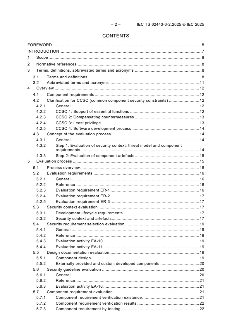 IEC TS 62443-6-2:2025 specifies the evaluation methodology to support achieving repeatable and reproducible evaluation results for IACS components under evaluation against IEC 62443-4-2 requirements. This document does not specify the definition of a complete certification scheme or certification program. This document does not specify the process evaluations of the secure development lifecycle according to IEC 62443‑4‑1. The existing secure development lifecycle according to IEC 62443‑4‑1 is a prerequisite in this evaluation methodology. This document does not specify particular tools, e.g. for the use in vulnerability or penetration testing. This document does not focus on lACS components which were not developed according to the lifecycle process of IEC 62443‑4‑1.