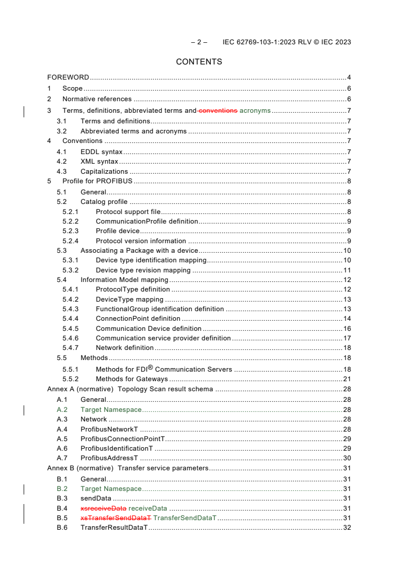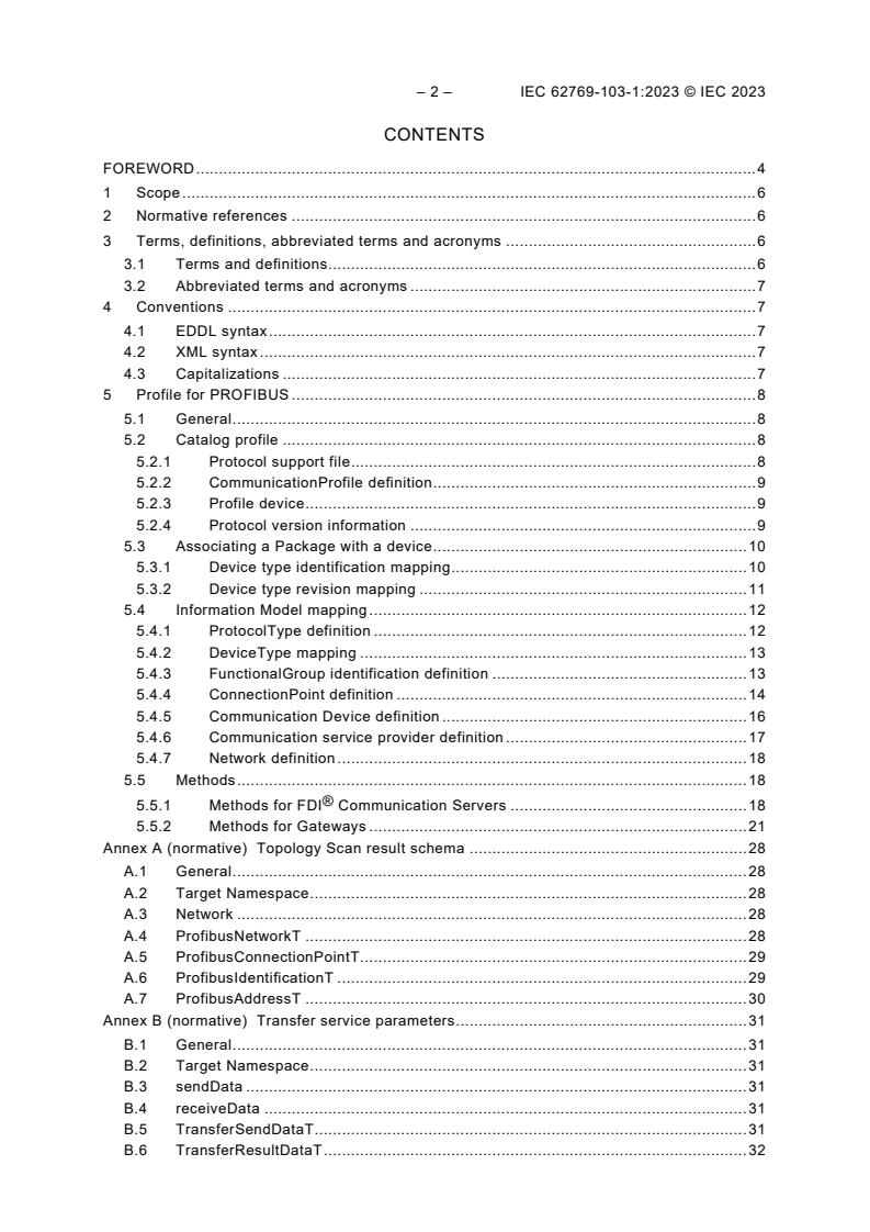 IEC 62769-103-1:2023 specifies an FDI®[1] profile of IEC 62769 for IEC 61784-1_CP 3/1 (PROFIBUS DP)[2] and IEC 61784-1_CP3/2 (PROFIBUS PA). [1] FDI is a registered trademark of the non-profit organization Fieldbus Foundation, Inc. This information is given for the convenience of users of this document and does not constitute an endorsement by IEC of the trademark holder or any of its products. Compliance does not require use of the trade name. Use of the trade name requires permission of the trade name holder. [2] PROFIBUS is the trade name of the non-profit consortium PROFIBUS & PROFINET International. This information is given for the convenience of users of this technical report and does not constitute an endorsement by IEC of the trademark holder or any of its products. Compliance does not require use of the trade name. Use of the trade name requires permission of the trade name holder.