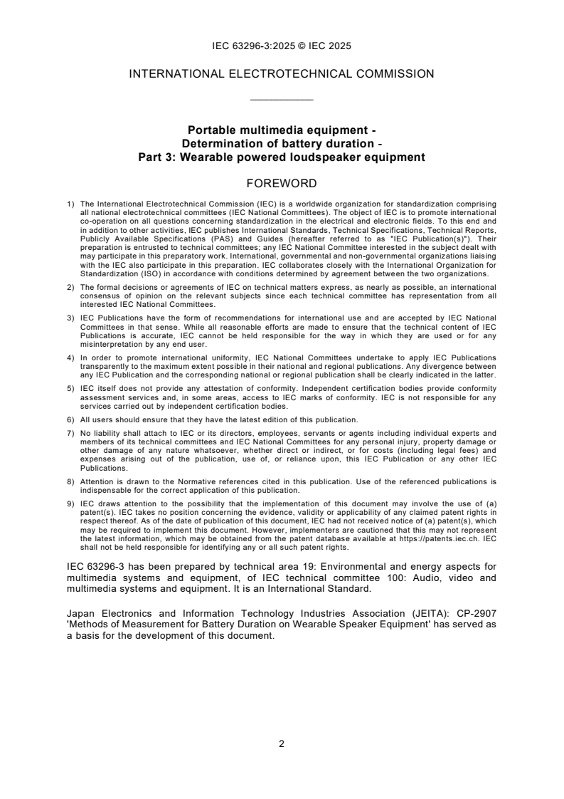 IEC 63296-3:2025 is a standard published by the International Electrotechnical Commission (IEC). Its full title is "Portable multimedia equipment - Determination of battery duration - Part 3: Wearable powered loudspeaker equipment". This standard covers: IEC 63296-3:2025 specifies the method for measuring the battery duration at a defined sound pressure level for continuous music playback of battery-operated wearable powered loudspeaker equipment. A primary battery or secondary battery can be used as a power source for such a shoulder-carried or body-worn loudspeaker and its composite device. In addition, only equipment that can be placed on or hung from a head and torso simulator (HATS) is covered. Bone conduction speakers are excluded. Portable loudspeaker equipment also supporting video playback as the main function is not covered by this document.