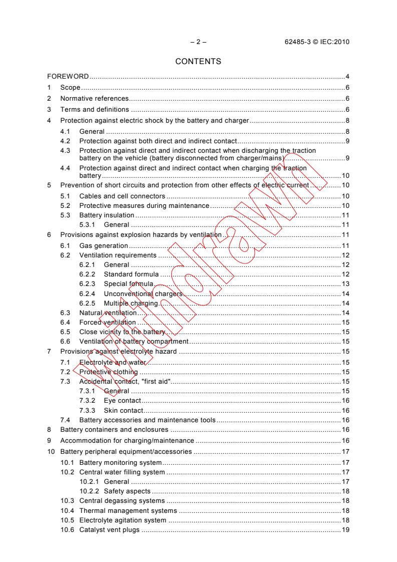 La CEI 62485-3:2010 s'applique aux installations d'éléments et de batteries d'accumulateurs utilisées pour les véhicules électriques par exemple dans les chariots électriques industriels (y compris chariots élévateurs, tracteurs, machines de nettoyage, véhicules automatiques guidés), locomotives alimentées par batteries, véhicules électriques routiers (par exemple véhicules pour le transport de marchandises, voiturettes de golf, bicyclettes, chaises roulantes), et ne couvre pas la conception de tels véhicules. Cette norme internationale couvre les accumulateurs au plomb/dioxyde de plomb (plomb acide), oxyde de nickel/cadmium, oxyde de nickel/hydrure métallique et autres accumulateurs alcalins. Les aspects de sécurité des accumulateurs lithium dans ces applications seront couverts par les normes qui leur sont propres. Les tensions nominales sont limitées respectivement à 1 000 V en courant alternatif et 1 500 V en courant continu et donnent les principales mesures de protection contre les risques produits en général par l'électricité, les émissions de gaz et l'électrolyte. Elle fournit les exigences concernant les aspects de sécurité liés à la mise en oeuvre, à l'utilisation, au contrôle, à la maintenance et à la mise au rebut des batteries.