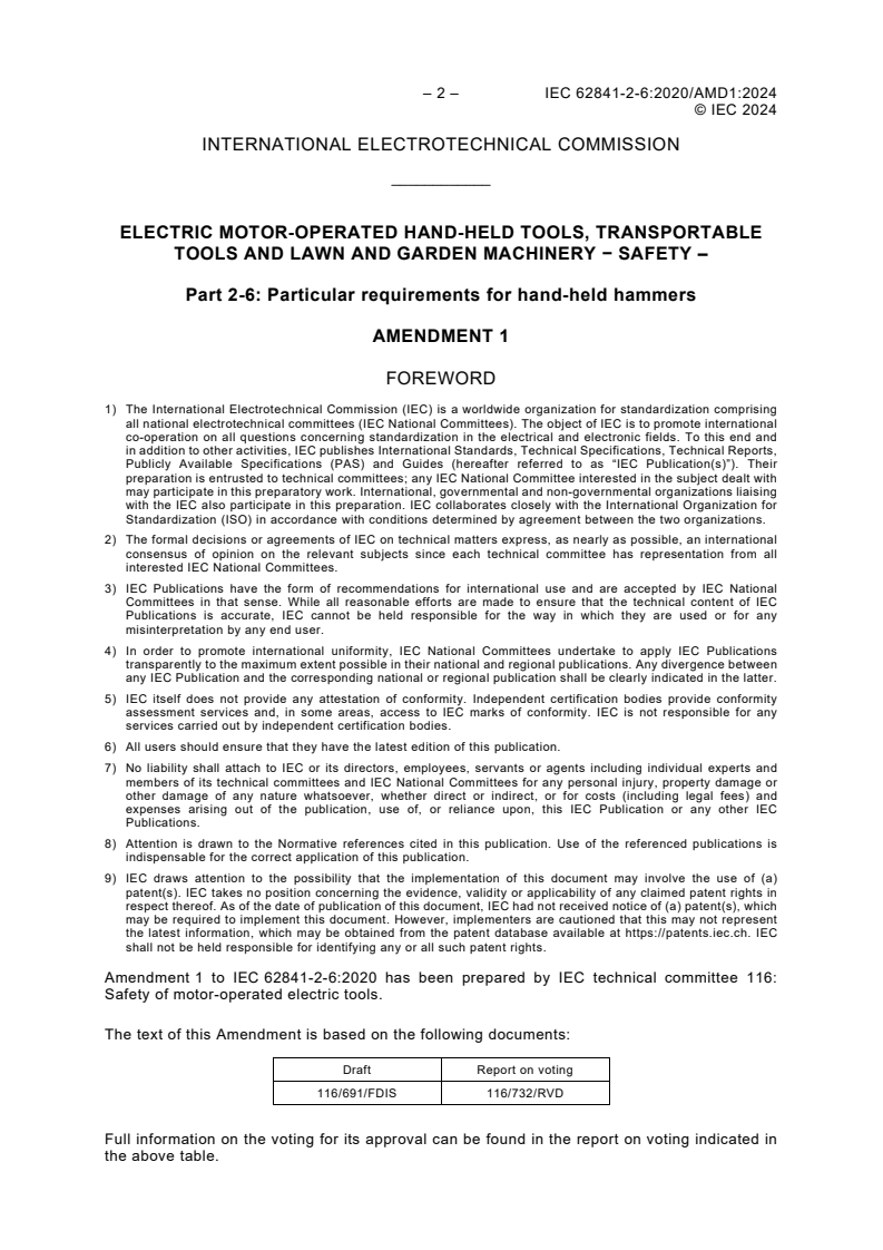 IEC 62841- 2-6 ED1:2023 AMD 1 supplements or modifies the corresponding clauses in IEC 62841-1, so as to convert it into the IEC Standard: Particular requirements for hand-held hammers Tools covered by this document include percussion hammers and rotary hammers, including rotary hammers with the capability to rotate only with the percussion system disengaged (drill only mode). This document does not apply to drills and impact drills. NOTE 101 Drills and impact drills are covered by IEC 62841-2-1. This document does not apply to tools that are designed exclusively for driving fasteners, such as palm nailers.