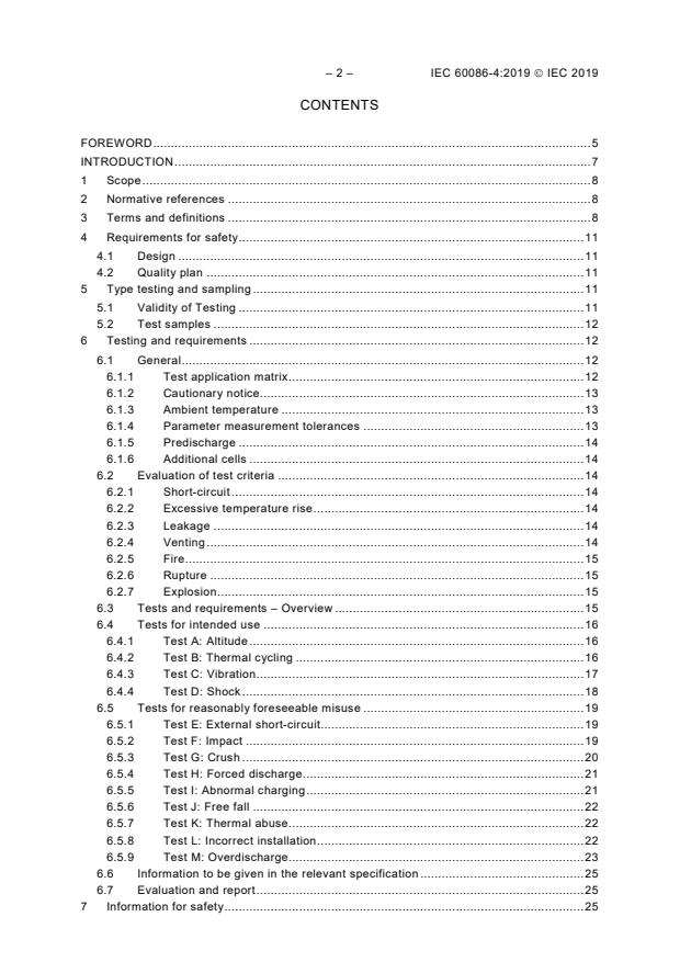 IEC 60086-4:2019 specifies tests and requirements for primary lithium batteries to ensure their safe operation under intended use and reasonably foreseeable misuse. NOTE Primary lithium batteries that are standardized in IEC 60086-2 are expected to meet all applicable requirements herein. It is understood that consideration of this part of IEC 60086 might also be given to measuring and/or ensuring the safety of non-standardized primary lithium batteries. In either case, no claim or warranty is made that compliance or non-compliance with this standard will fulfil or not fulfil any of the user’s particular purposes or needs. This fifth edition cancels and replaces the fourth edition published in 2014. This edition constitutes a technical revision. This edition includes the following significant technical changes with respect to the previous edition: