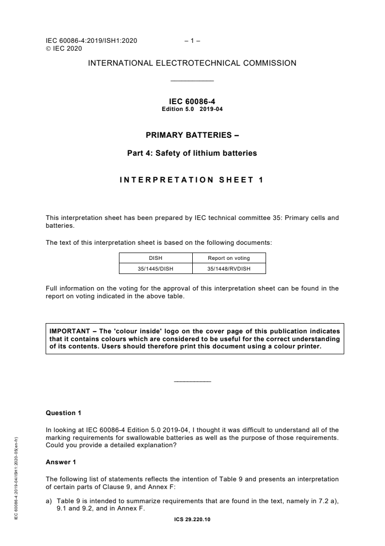 IEC 60086-4:2019 is a standard published by the International Electrotechnical Commission (IEC). Its full title is "Primary batteries - Part 4: Safety of lithium batteries". This standard covers: IEC 60086-4:2019 specifies tests and requirements for primary lithium batteries to ensure their safe operation under intended use and reasonably foreseeable misuse. NOTE Primary lithium batteries that are standardized in IEC 60086-2 are expected to meet all applicable requirements herein. It is understood that consideration of this part of IEC 60086 might also be given to measuring and/or ensuring the safety of non-standardized primary lithium batteries. In either case, no claim or warranty is made that compliance or non-compliance with this standard will fulfil or not fulfil any of the user’s particular purposes or needs. This fifth edition cancels and replaces the fourth edition published in 2014. This edition constitutes a technical revision. This edition includes the following significant technical changes with respect to the previous edition: a) Revised criteria for an explosion; b) Addition of test parameters for the overdischarge test of battery types FR14505 and FR10G445; c) Addition of a new subclause 5.1 Validity of Testing; d) revised pictogram E in Table D.1; e) Addition of Annex E with requirements for child resistant packaging of coin cells; f) Addition of Annex F with recommendations on the use of the KEEP OUT OF REACH OF CHILDREN safety sign. Keywords: lithium batteries The contents of the corrigendum of October 2019 and April 2020 and the Interpretation sheet of May 2020 have been included in this copy.