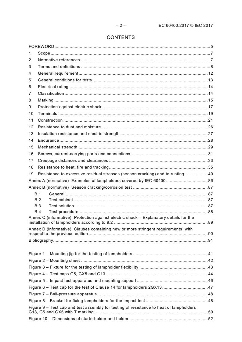 IEC 60400:2017 states the technical and dimensional requirements for lampholders for tubular fluorescent lamps and for starterholders, and the methods of test to be used in determining the safety and the fit of the lamps in the lampholders and the starters in the starterholders.