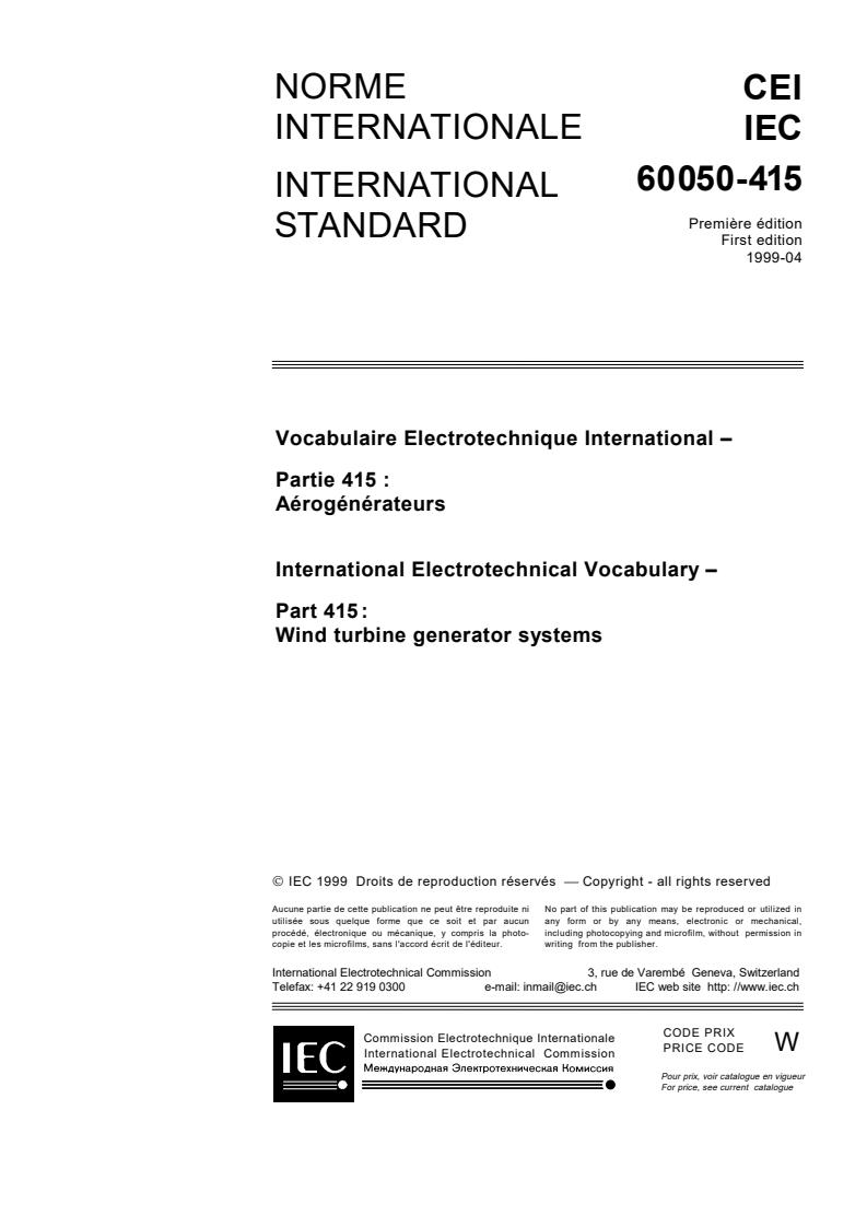IEC 60050-415:1999 is an essential international standard published by the International Electrotechnical Commission (IEC), providing a comprehensive vocabulary dedicated to wind turbine generator systems. As part 415 of the International Electrotechnical Vocabulary (IEV), this horizontal standard plays a key role in standardizing terminology specific to wind turbines and associated electrical and mechanical components. It aims to unify technical language globally, facilitating clear communication across the wind energy sector, regulatory bodies, and standardization organizations.