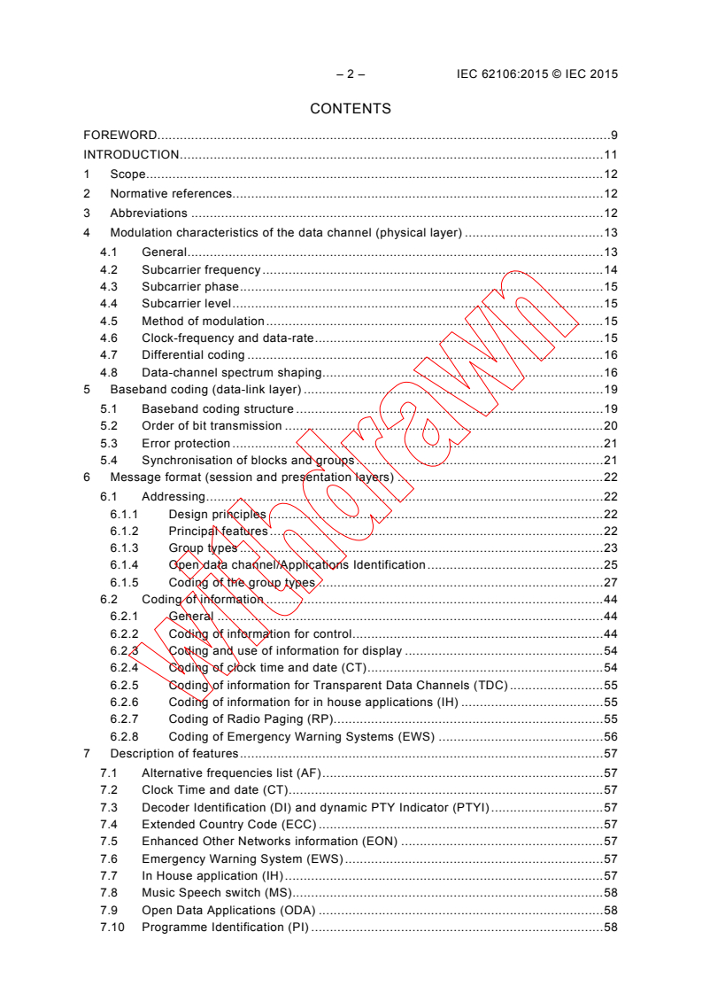 IEC 62106:2015(E) describes the Radio Data System, RDS, intended for application to VHF/FM sound broadcasts in the range 87,5 MHz to 108,0 MHz which may carry either stereophonic (pilot-tone system) or monophonic programmes (as stated in ITU-R Recommendation BS 450-3 and ITU-R Recommendation BS.643-3). The main objectives of RDS are to enable improved functionality for FM receivers and to make them more user-friendly by using features such as Programme Identification, Programme Service name display and, where applicable, automatic tuning for portable and car radios, in particular. The relevant basic tuning and switching information therefore has to be implemented by the type 0 group (see 6.1.5.1), and it is not optional unlike many of the other possible features in RDS. This third edition cancels and replaces the second edition, published in 2009 and constitutes a technical revision. It includes the following changes:
