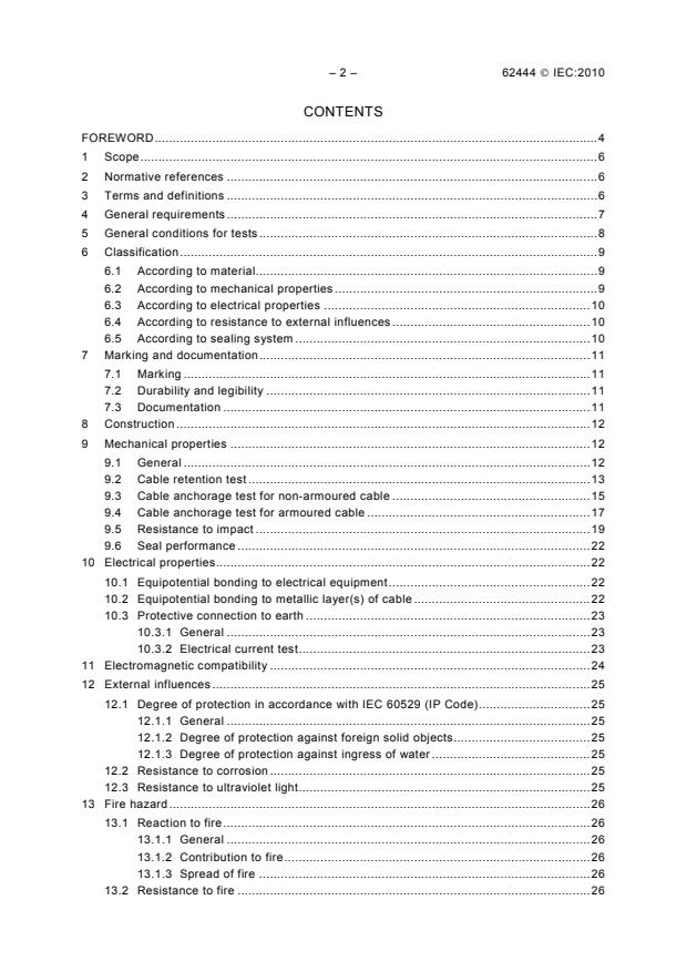 IEC 62444:2010 provides requirements and tests for the construction and performance of cable glands. This standard covers complete cable glands as supplied by the manufacturer or the supplier responsible for placing the product on the market. This standard does not cover cable glands for mineral insulated cables. This standard covers cable glands with IEC 60423 metric entry threads. This standard can be used as a guide for cable glands with other type of entry threads.