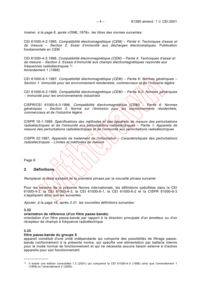 IEC 61260:1995/AMD1:2001 is a standard published by the International Electrotechnical Commission (IEC). Its full title is "Amendment 1 - Electroacoustics - Octave-band and fractional-octave-band filters". This standard covers: Specifies requirements for bandpass filters with respect to their immunity to power- and radio-frequency electromagnetic fields and to electrostatic discharge, and the permitted radio-frequency electromagnetic emissions, together with test procedures to demonstrate conformance to the specifications of this standard.