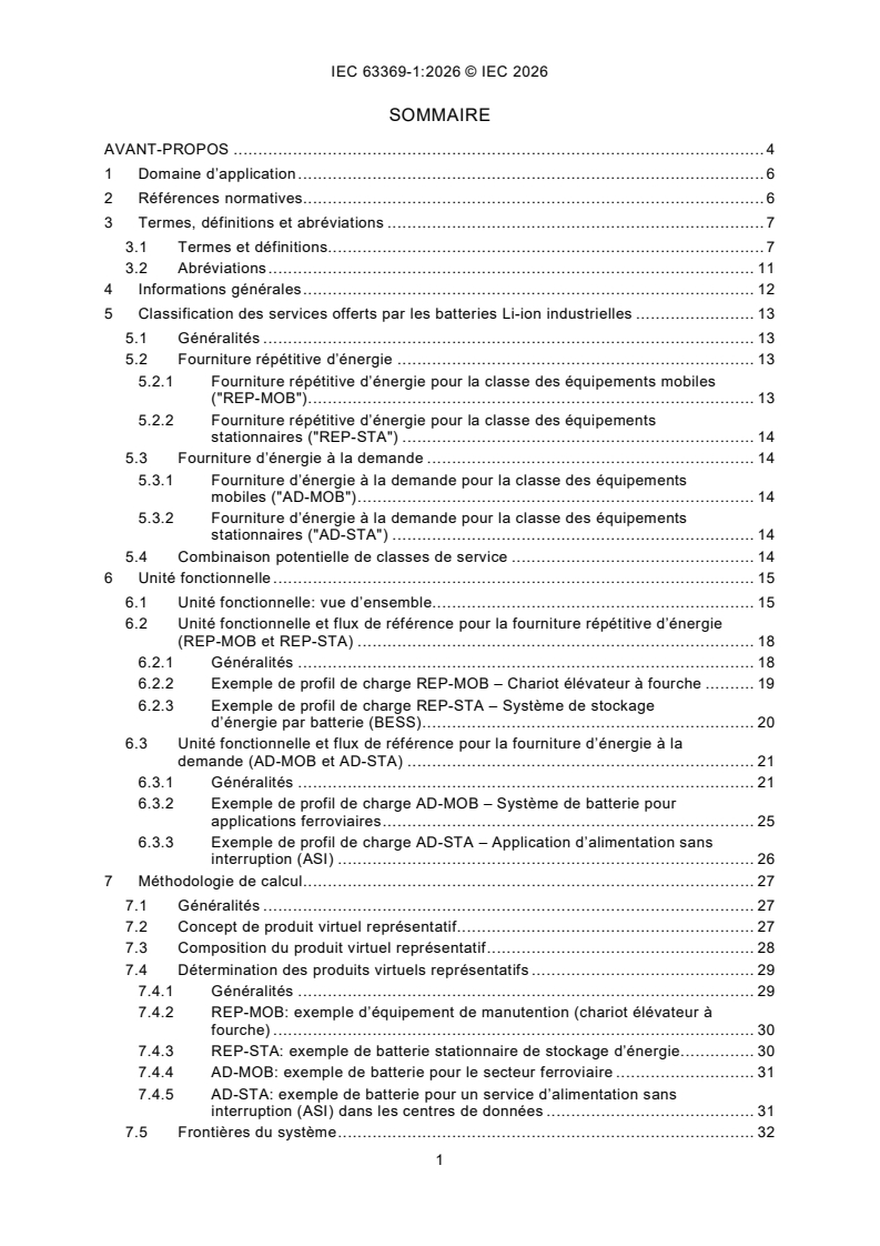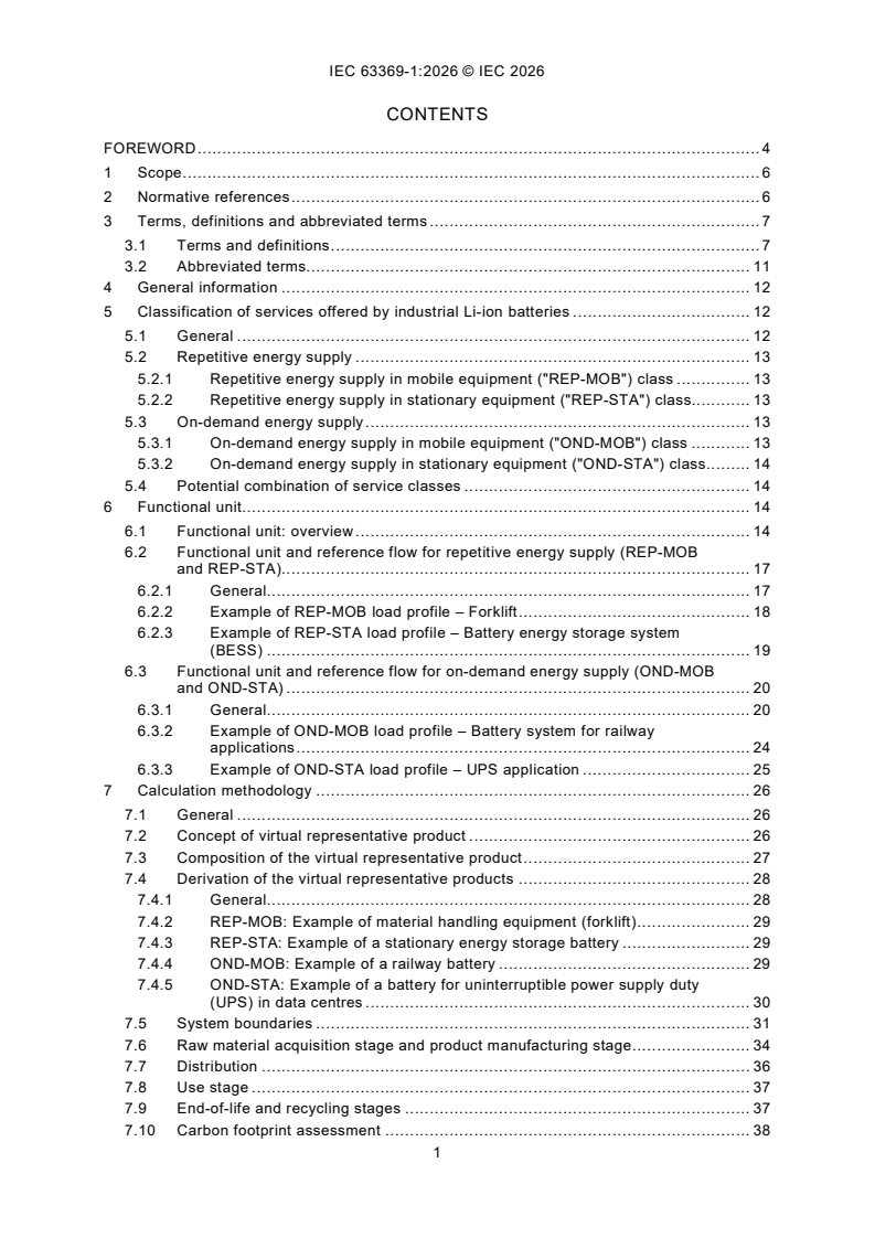 IEC 63369-1:2026 addresses general requirements and methodology, whereas intended IEC 63369-2 and intended IEC 63369-3 address applications of the methodology and default values of the CFF parameters by geographic area (see Annex B). This document provides a comprehensive methodology for the calculation of carbon footprint of industrial type Li-ion battery systems from cradle to grave. Second life and/or usage that was not intended when the battery was put on the market is not taken into account in this document. This document, along with the other parts of this series, does not apply to batteries for portable, SLI and electric road vehicle traction applications. The definition of the parameters used for the carbon footprint calculation allows for comparability of results for all rechargeable Li-ion chemistries. Classes of representative products are defined in this document to allow comparison inside each class. This methodology, based on the data provided by the battery manufacturer, is mainly intended to allow a carbon footprint assessment of several battery solutions over the Cumulated Requested Service (CRS). This assessment can be used in the selection process of the battery purchaser. The methodology can also be used for a variety of purposes such as battery system development, eco-design and participation in voluntary or mandatory programs. The methodology in this document is based exclusively on attributional life cycle assessment (LCA). The carbon footprint calculation of charging equipment and power conversion equipment not necessary for battery functions is not covered in this document.
