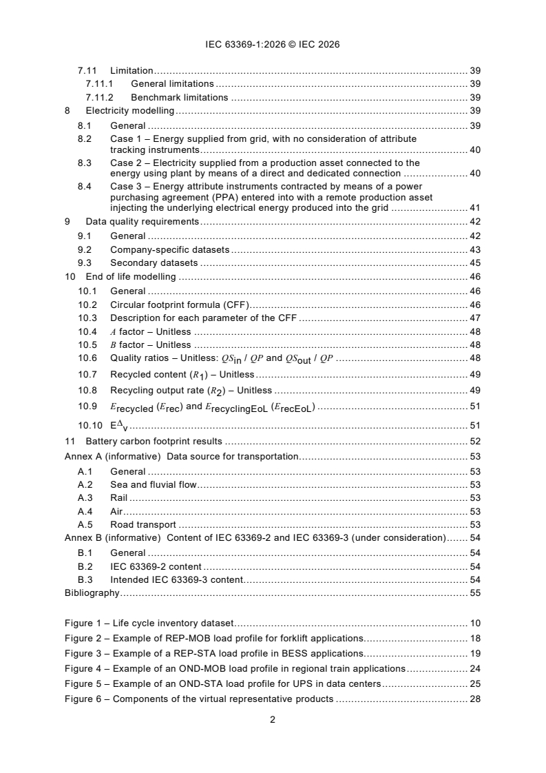 IEC 63369-1:2026 is a standard published by the International Electrotechnical Commission (IEC). Its full title is "Carbon footprint calculation applicable to industrial lithium-ion batteries - Part 1: General requirements and methodology". This standard covers: IEC 63369-1:2026 addresses general requirements and methodology, whereas intended IEC 63369-2 and intended IEC 63369-3 address applications of the methodology and default values of the CFF parameters by geographic area (see Annex B). This document provides a comprehensive methodology for the calculation of carbon footprint of industrial type Li-ion battery systems from cradle to grave. Second life and/or usage that was not intended when the battery was put on the market is not taken into account in this document. This document, along with the other parts of this series, does not apply to batteries for portable, SLI and electric road vehicle traction applications. The definition of the parameters used for the carbon footprint calculation allows for comparability of results for all rechargeable Li-ion chemistries. Classes of representative products are defined in this document to allow comparison inside each class. This methodology, based on the data provided by the battery manufacturer, is mainly intended to allow a carbon footprint assessment of several battery solutions over the Cumulated Requested Service (CRS). This assessment can be used in the selection process of the battery purchaser. The methodology can also be used for a variety of purposes such as battery system development, eco-design and participation in voluntary or mandatory programs. The methodology in this document is based exclusively on attributional life cycle assessment (LCA). The carbon footprint calculation of charging equipment and power conversion equipment not necessary for battery functions is not covered in this document.
