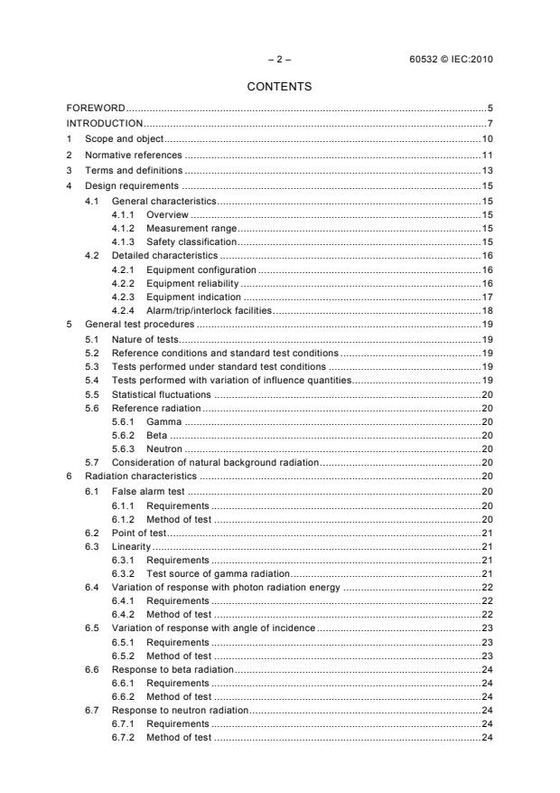 IEC 60532:2010 applies to installed dose rate meters, warning assemblies and monitors that are used to prevent or mitigate a minor radioactive release, or minor degradation of fuel, within the nuclear power plants/nuclear facility design basis, and to warn personnel or to ensure their safety during or following events that involve or result in release of radioactivity in the nuclear power plants/nuclear facility, or risk of radiation exposure. This equipment is typically classified as category "A" or "B" or "C" or "not classified" in IEC 61226. The main technical changes with regard to the previous edition are updates taking account of the requirements of IEC standards published since 1996.