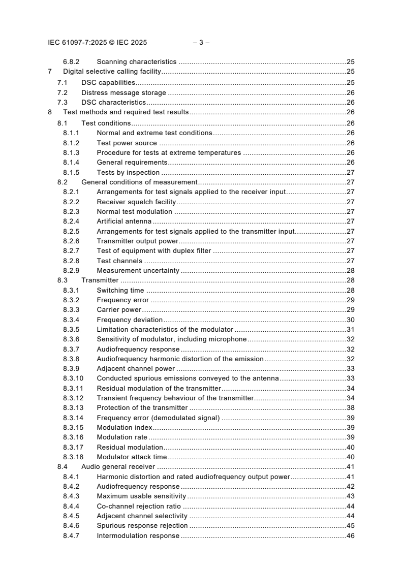 IEC 61097-7:2025 specifies the minimum performance requirements, technical characteristics and test methods with required test results for VHF radio installations capable of voice communication and digital selective calling as required by chapter IV of the International Convention for Safety of Life at Sea (SOLAS).