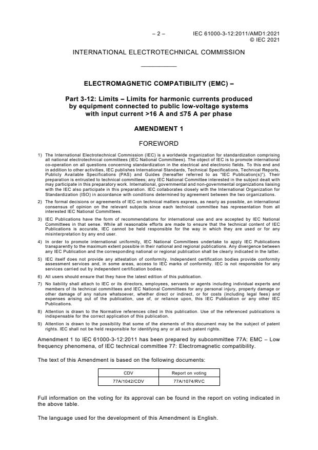 IEC 61000-3-12:2011/AMD1:2021 is a standard published by the International Electrotechnical Commission (IEC). Its full title is "Amendment 1 - Electromagnetic compatibility (EMC) - Part 3-12: Limits - Limits for harmonic currents produced by equipment connected to public low-voltage systems with input current >16 A and ≤ 75 A per phase". This standard covers: Amendment 1 - Electromagnetic compatibility (EMC) - Part 3-12: Limits - Limits for harmonic currents produced by equipment connected to public low-voltage systems with input current >16 A and ≤ 75 A per phase