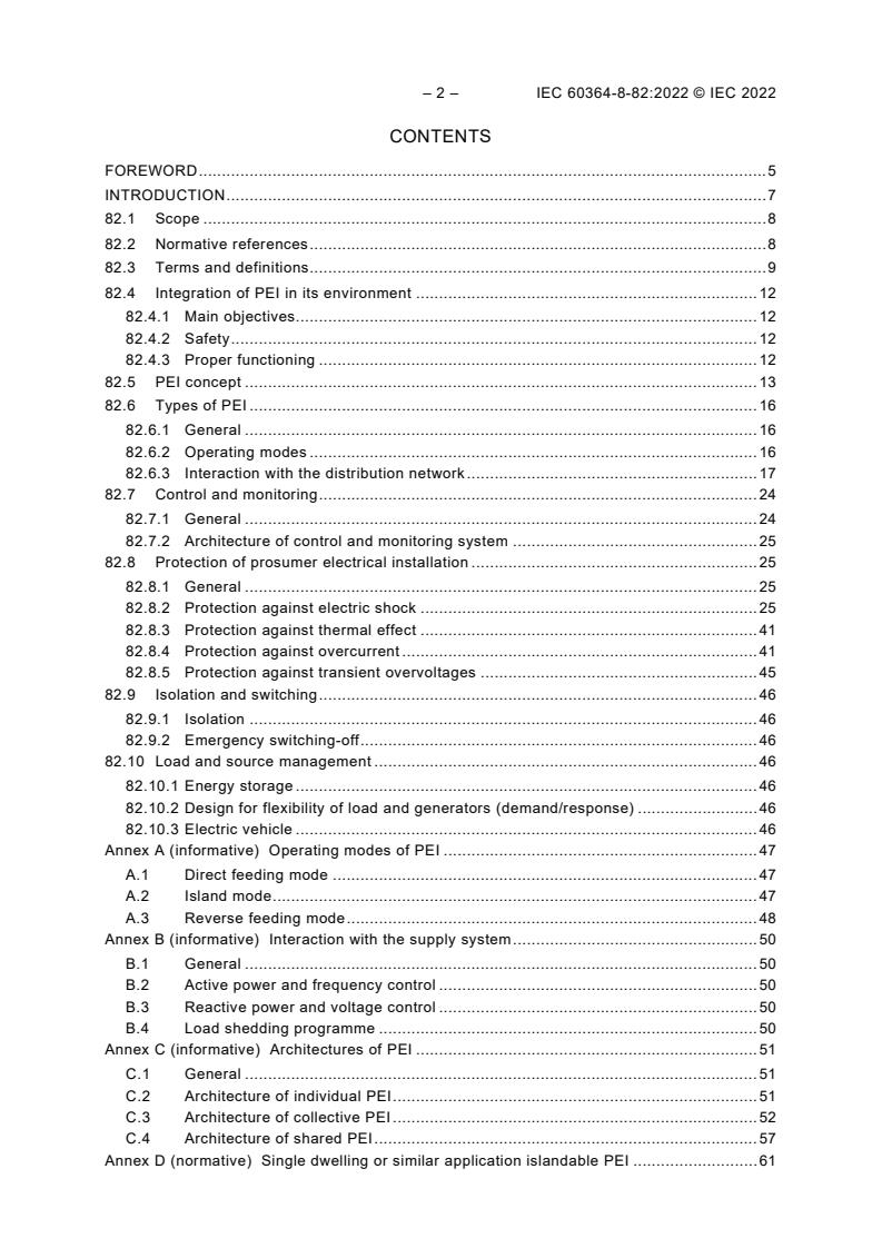 IEC 60364-8-82:2022 provides requirements and recommendations that apply to low-voltage electrical installations connected or not to a distribution network able to operate: – with local power supplies, and/or – with local storage units, and that monitors and controls the energy from the locally connected sources delivering it to: – current-using equipment, and/or – local storage units, and/or – distribution networks. Such electrical installations are designated as prosumer's electrical installations (PEIs). These requirements and recommendations apply to new installations and modifications of existing installations. This document also provides requirements and recommendations for the safe, efficient and correct behaviour of these installations when integrated into a smart grid. Information related to grid interaction to ensure the stability of the electrical system for grid connected PEIs is given in Annex B. This document covers the requirements related to stability of islanded and stand-alone PEIs. This first edition cancels and replaces IEC 60364-8-2 published in 2018. This edition constitutes a technical revision. This edition includes the following significant technical changes with respect to IEC 6036482:2018: a) the vocabulary and concepts have been aligned as much as possible with those used by TC 8 and SC 8B, taking notably into account the IEC 62898 and IEC 62786 series, still respecting the installers mindset (installers being the first users of the IEC 60364 series and being used to only refer to the IEC 60364 series); b) the type of system earthing and the change of type of system earthing (sequencing) when there is a change of mode of the prosuming installation, have been clarified; c) the conditions of connection and disconnection from the DSO network have also been described, both from the safety point of view and the proper functioning point of view; d) additional requirements have been introduced; e) the figures have been updated; f) a new normative Annex D on single dwelling or similar application islandable PEIs has been added; g) the numbering has also been reviewed to follow the updated numbering system of the IEC 60364 series, in line with the IEC Directives and compatible with Parts 7.