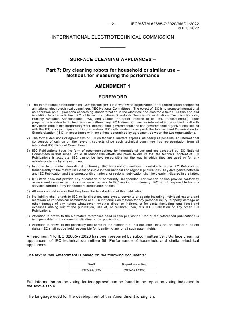 IEC/ASTM 62885-7:2020/AMD1:2022 is a standard published by the International Electrotechnical Commission (IEC). Its full title is "Amendment 1 - Surface cleaning appliances - Part 7: Dry cleaning robots for household or similar use - Methods for measuring the performance". This standard covers: Amendment 1 - Surface cleaning appliances - Part 7: Dry cleaning robots for household or similar use - Methods for measuring the performance