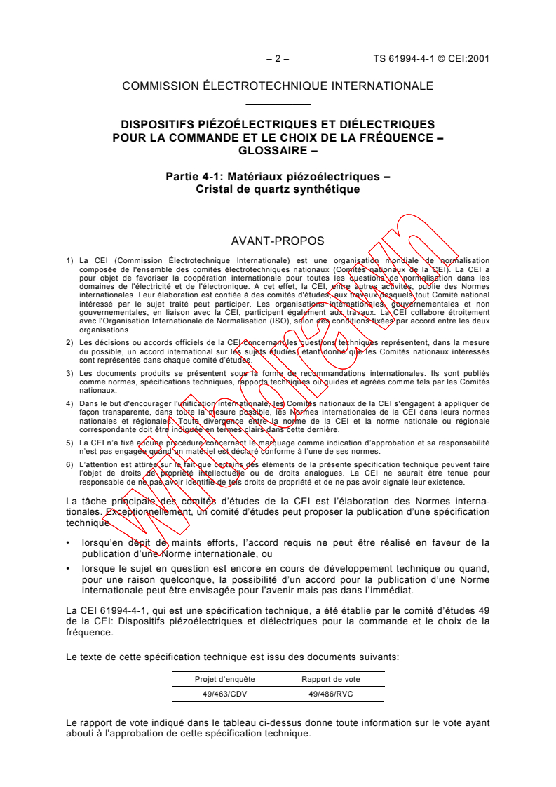 IEC TS 61994-4-1:2001 is a technical specification published by the International Electrotechnical Commission (IEC). Its full title is "Piezoelectric and dielectric devices for frequency control and selection - Glossary - Part 4-1: Piezoelectric materials - Synthetic quartz crystal". This standard covers: Is a technical specification giving the terms and definitions for synthetic quartz single crystals representing the present state-of-the-art, which are intended for manufacturing piezoelectric elements for frequency control and selection.