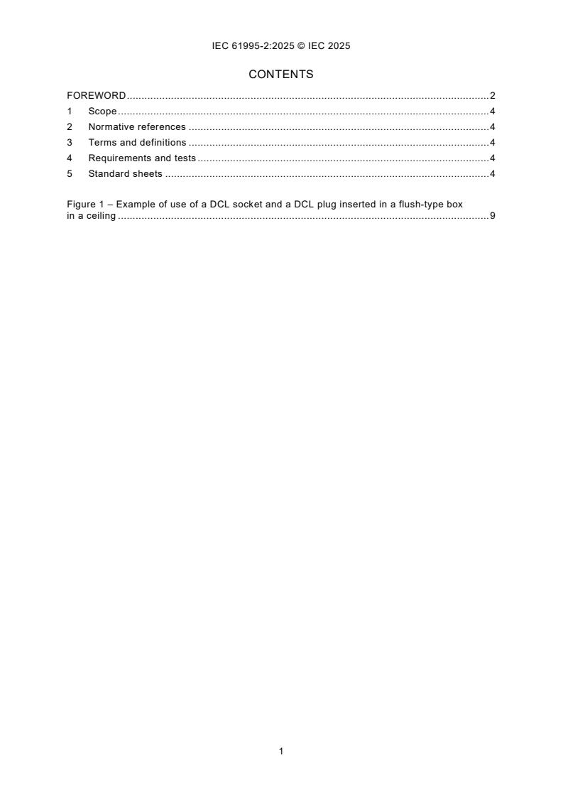 Keywords: IEC 61995-2:2025, devices for connection of luminaires, DCL plugs, DCL outlets, household lighting connection, standard sheets, 250 V AC luminaire connection, IEC electrical standards, fixed luminaires, luminaire interface design, electrical accessory standards, IEC lamp connection devices, luminaire connection safety, plug retention mechanism.