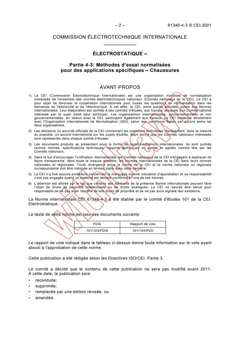 IEC 61340-4-3:2001 is a standard published by the International Electrotechnical Commission (IEC). Its full title is "Electrostatics - Part 4-3: Standard test methods for specific applications - Footwear". This standard covers: Describes a test method for determining the electrical resistance of footwear used in the control of electrostatic potential on people. This standard is suitable for use by the manufacturer of footwear as well as the end user. A method for measuring the electrical resistance of footwear alone is described and serves as an acceptance test for new footwear. Insulating footwear is not included within the scope of this standard although the electrical resistance measurement techniques may be applicable.